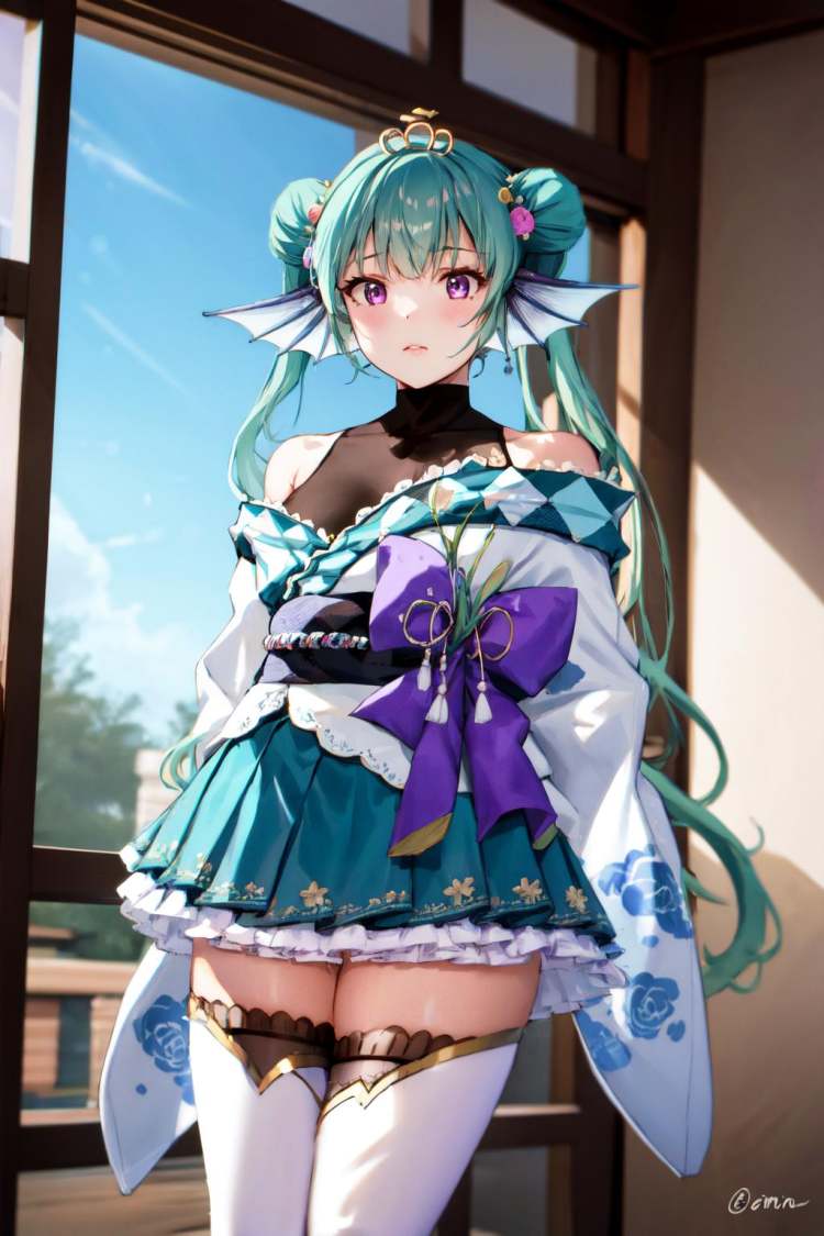 finana2st, twintails, tiara, purple bow, hair flower, white kimono, obi, sash, black bodysuit, green skirt, white thighhighs