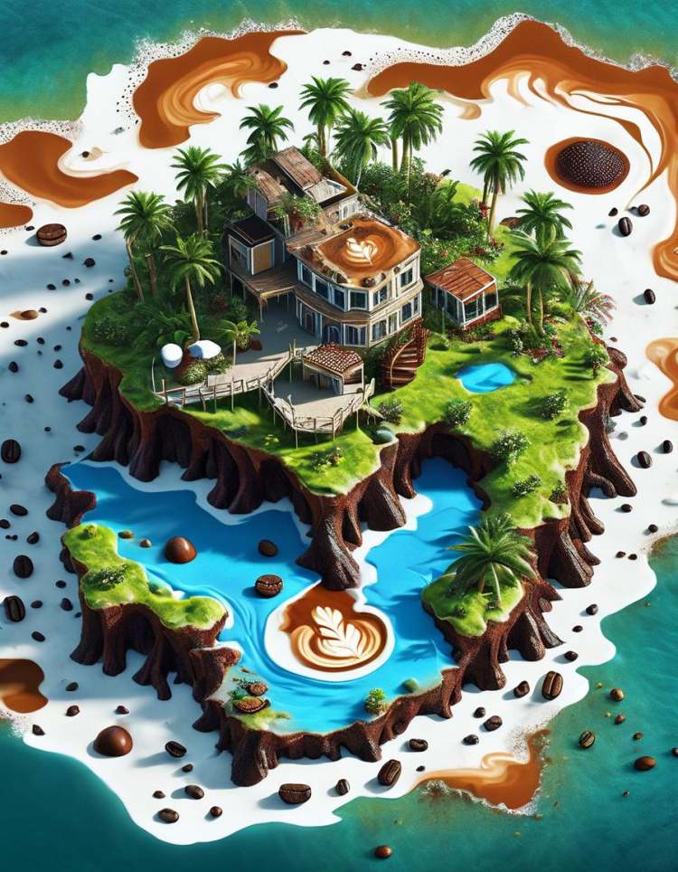 Welcome to a delectable world crafted from the rich essences of latte, coffee, and chocolate. The ground beneath your feet is a mosaic of coffee grounds, creating a warm and aromatic tapestry. Rivers flow with velvety latte, and the air carries the sweet perfume of cocoa.