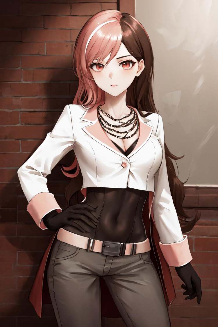 neopolitandef, necklace, white jacket, leotard, black gloves, black pants, belt