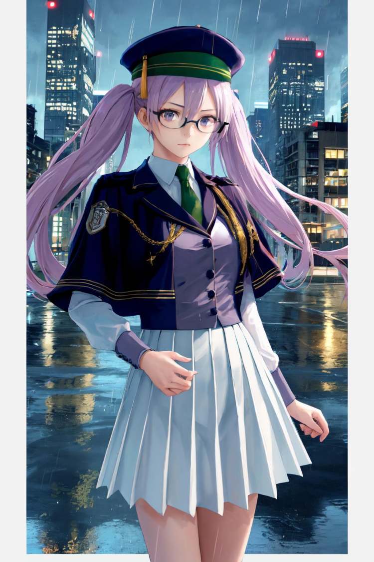 sokarisdef, glasses, hat, white shirt, green necktie, jacket, capelet, long sleeves, white skirt