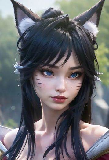 1girl, solo, long hair, breasts, blue eyes, large breasts, black hair, animal ears, cleavage, bare shoulders, medium breasts, upper body, detached sleeves, lips, fox ears, facial mark, whisker markings, korean clothes, ahri \(league of legends\)