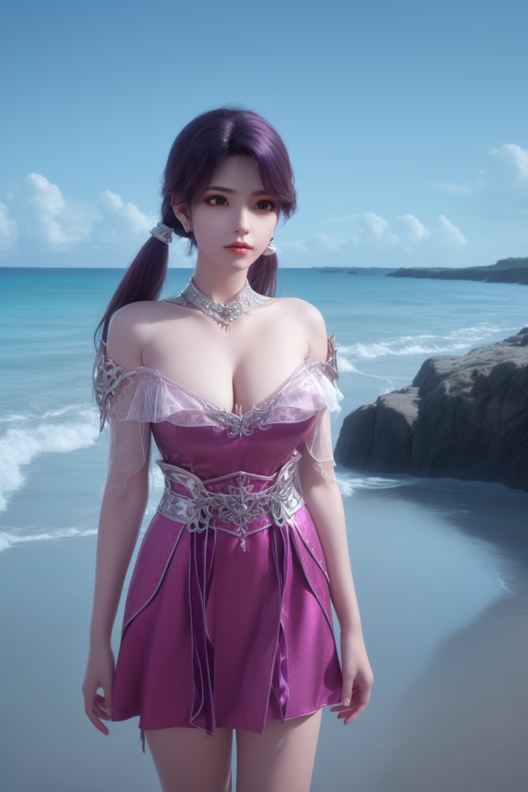 1girl,solo,large breasts,armor,purple dress,short dress,skirt,detached collar,skirt,torogao,bare shoulders,twintails,cleavage,