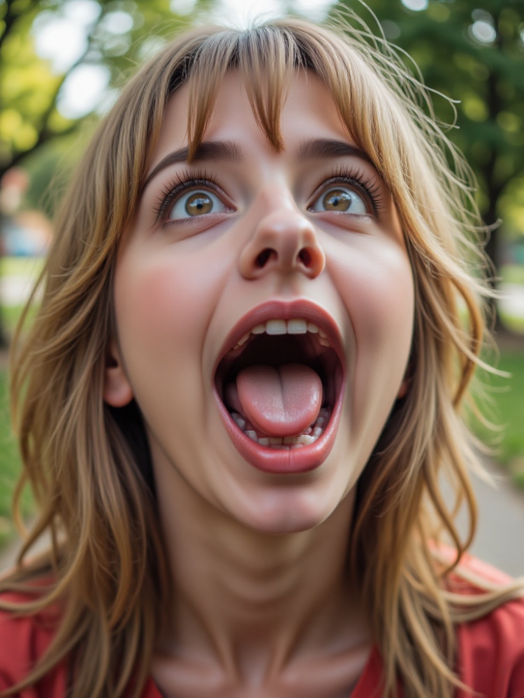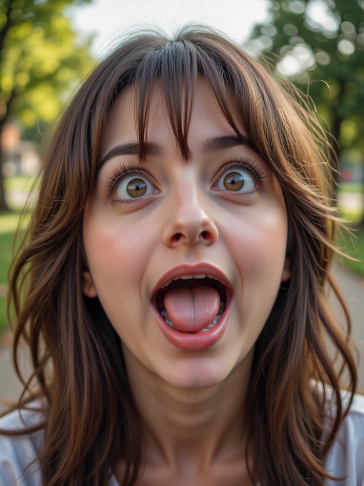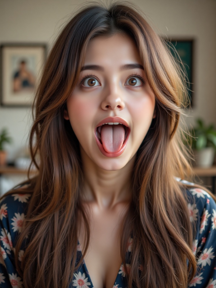 •推荐词: Weird pose,stick out your tongue,a young Asian woman with long dark brown hair,wearing a red and black dress with white flowers on it. Her eyes are blue,and her lips are painted pink. She is sticking her tongue out
