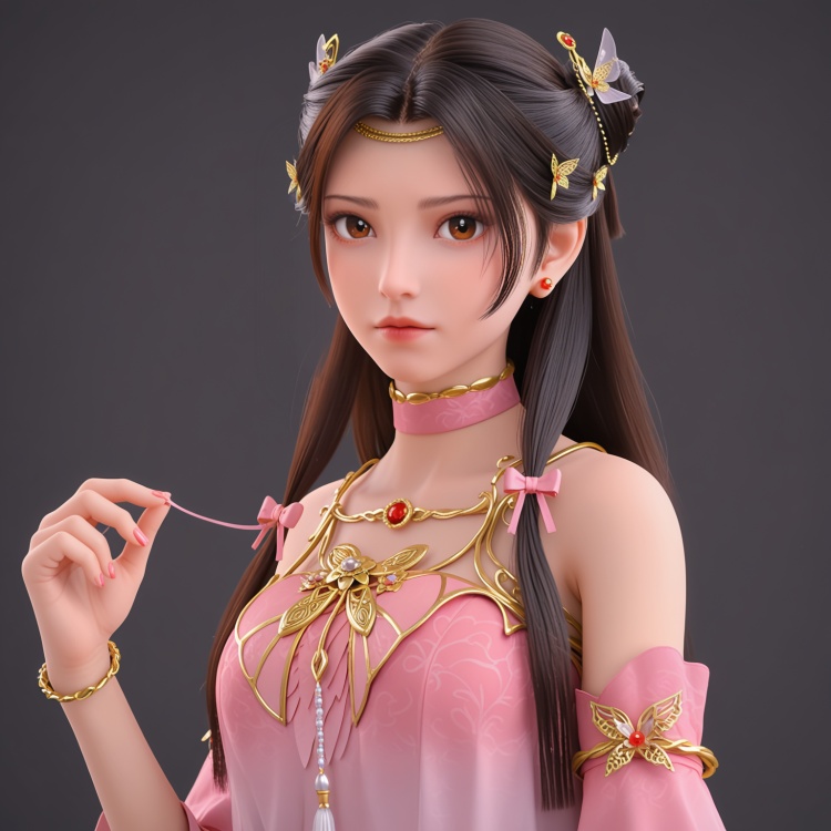 <lora:YQponytianlingerV4:0.8>,q1528437228,solo,jewelry,long_hair,hair_ornament,black_hair,dress,bare_shoulders,earrings,necklace,brown_eyes,choker,brown_hair,bracelet,detached_sleeves,realistic,pink_dress,see-through,hair_bun,pink_bow,ribbon,