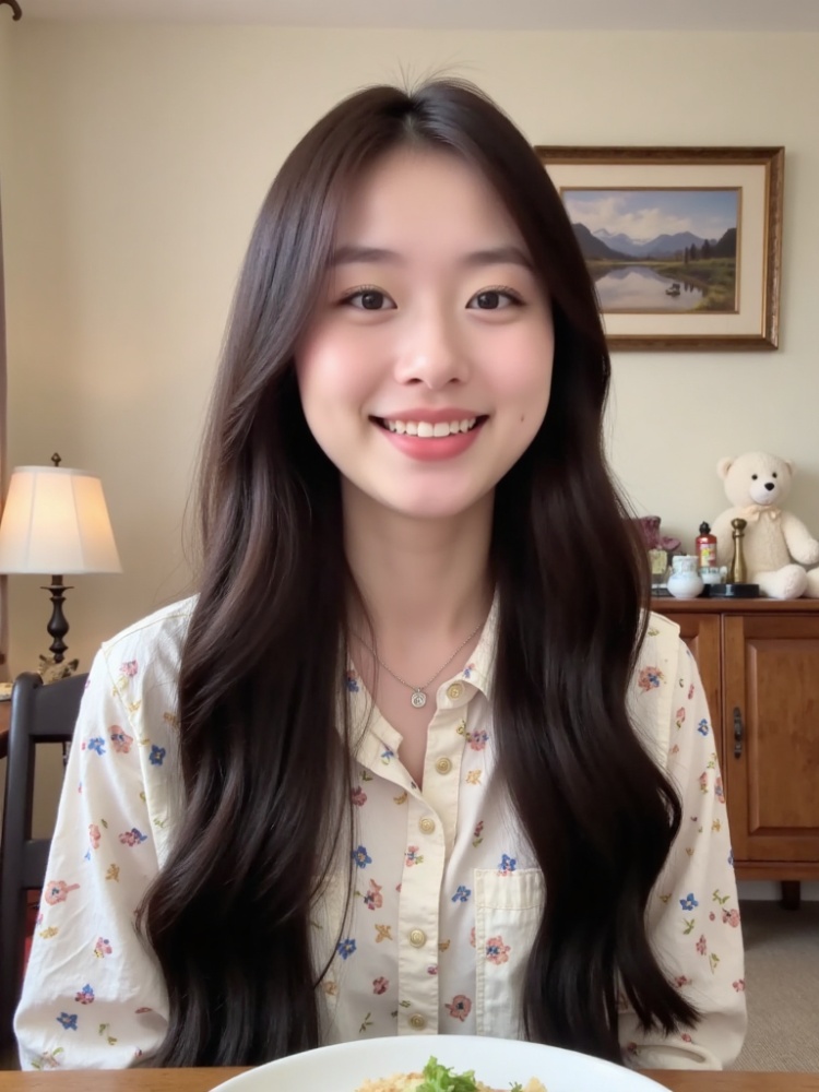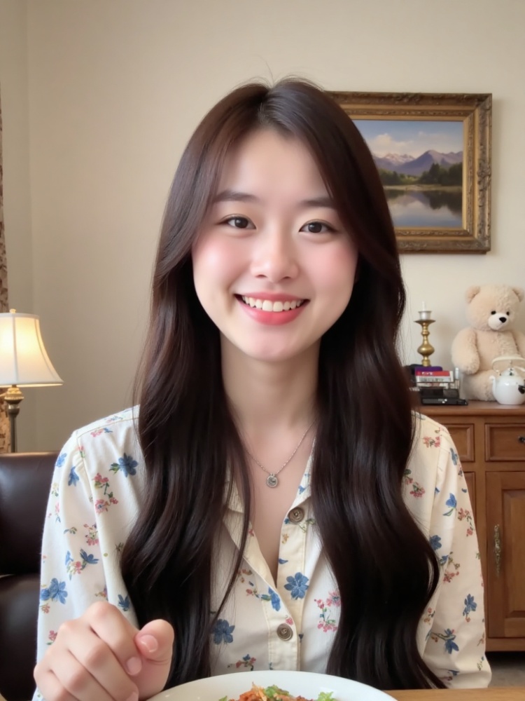 英文自然语言参考: The image captures a young woman, her long, dark - brown wavy hair cascading gently. She dons an off - white blouse dotted with charming pink floral motifs, and a delicate silver necklace graces her neck. A radiant smile lights up her face as she sits at a table, a plate of appetizing food before her. The backdrop features a softly glowing table lamp, a tastefully framed landscape painting that adds an artistic touch, and a wooden cabinet upon which a teddy bear sits, exuding a sense of warmth. The overall setting is inviting and cozy, creating a homely and pleasant ambiance.