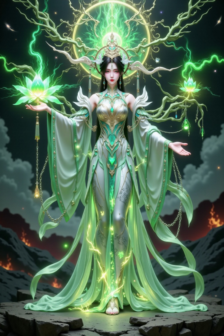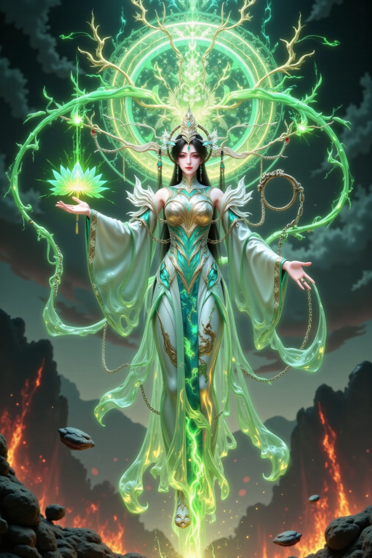 这幅图展示了一位身穿华丽绿色长裙的女性角色,她站在一个充满自然元素的神秘空间中。她的服装上装饰着精美的花纹和亮片,显得非常高贵典雅。她的头发长而飘逸,头上戴着一个精致的头饰,增添了几分神秘感。背景中可以看到一些发光的植物和藤蔓,以及一个巨大的吊灯,整个场景被柔和的绿色光芒照亮,营造出一种梦幻般的氛围。地面反射出周围的光线和植物的影子,使得整个画面更加生动和立体。