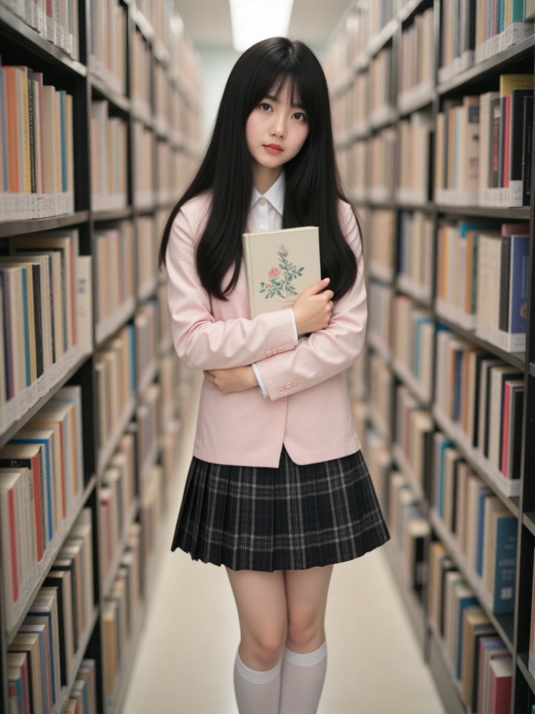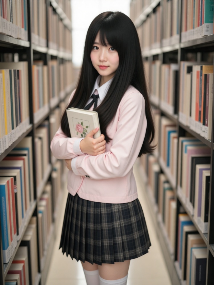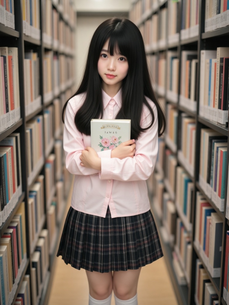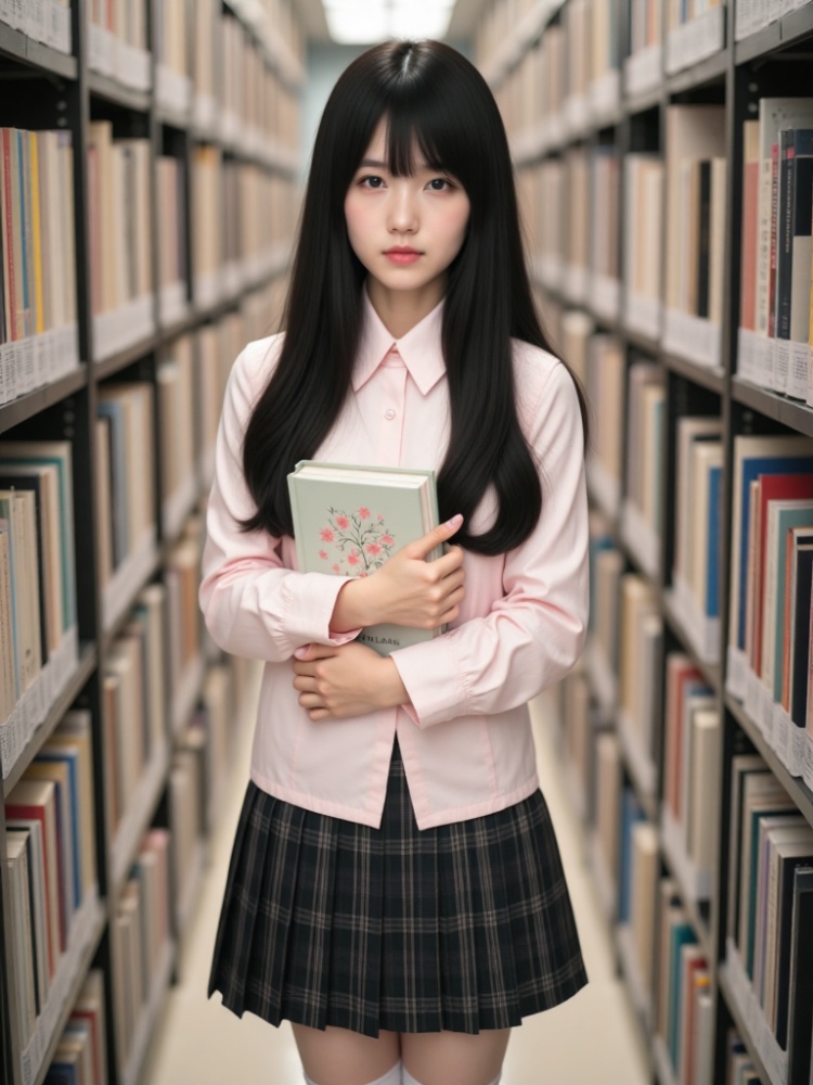 a female doll stands in a library, holding a book in her hands. She is dressed in a light pink shirt, a black plaid skirt, and white socks. Her long black hair is cascading down her shoulders, framing her face. The book she is holding is open, with a floral design on the cover. She's standing in front of a bookshelf, which is filled with books of various colors. The background is blurred, creating a stark contrast to the doll.