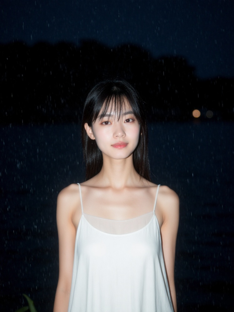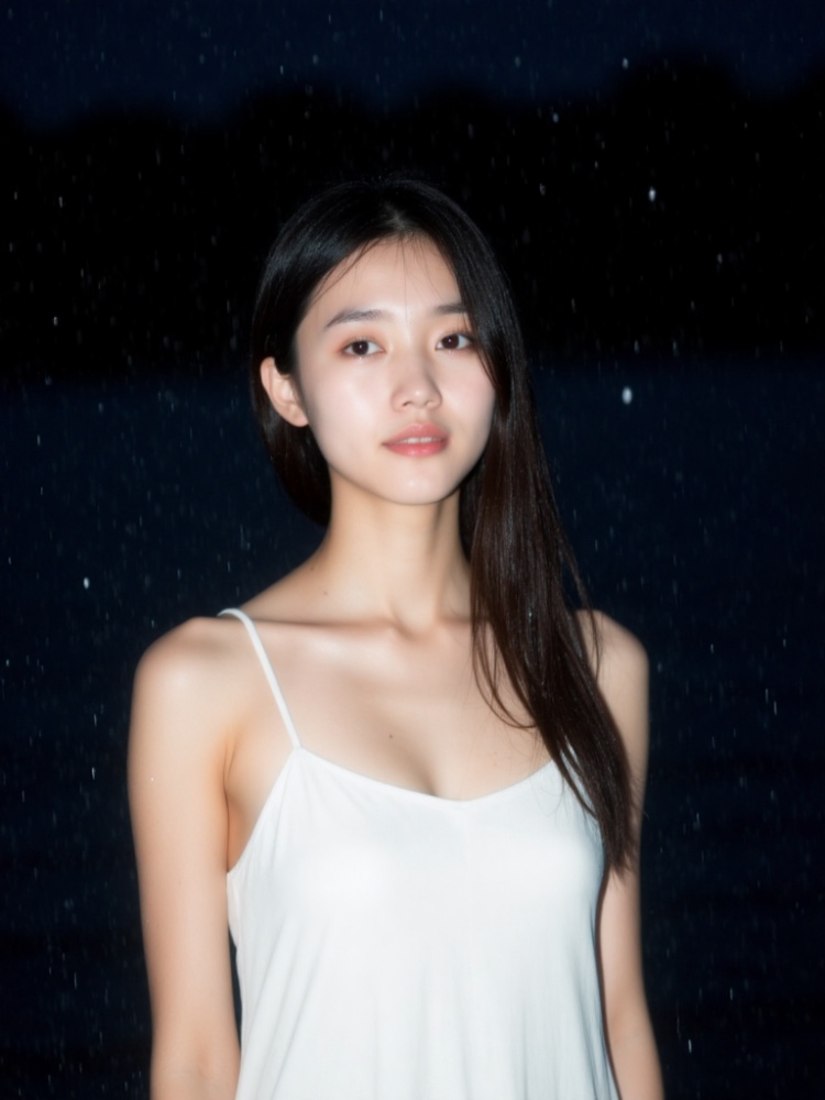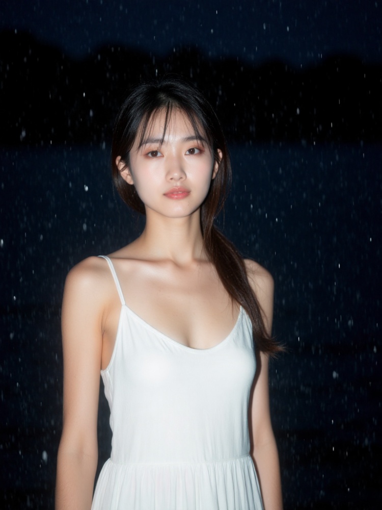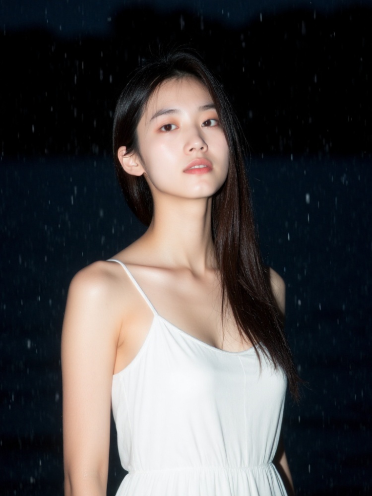 Captured at eye-level, a close-up shot of a young Asian woman stands in front of a backdrop of water droplets. She is dressed in a simple white sleeveless dress, adorned with a sheer neckline. Her hair is pulled back, cascading down to her shoulders, framing her face. The backdrop is dark, creating a stark contrast to the woman's white dress. The woman's expression is neutral, with a slight smile on her face, adding a pop of color to the scene.