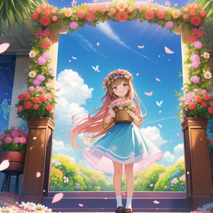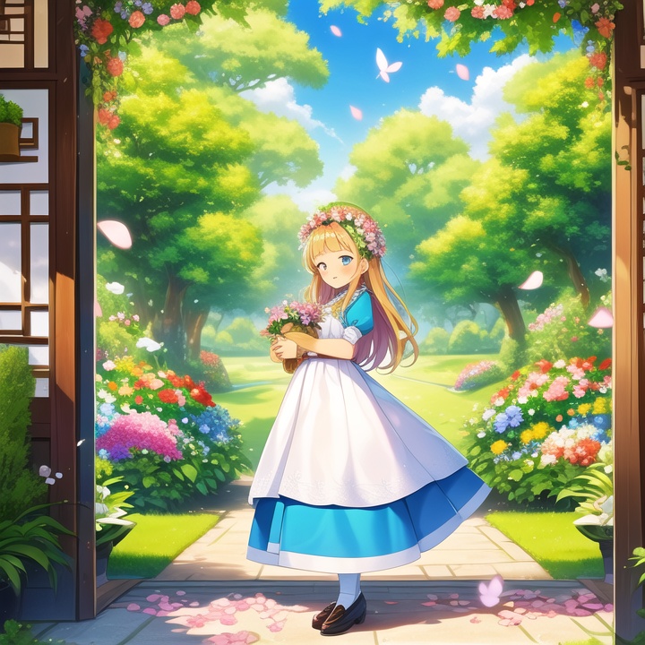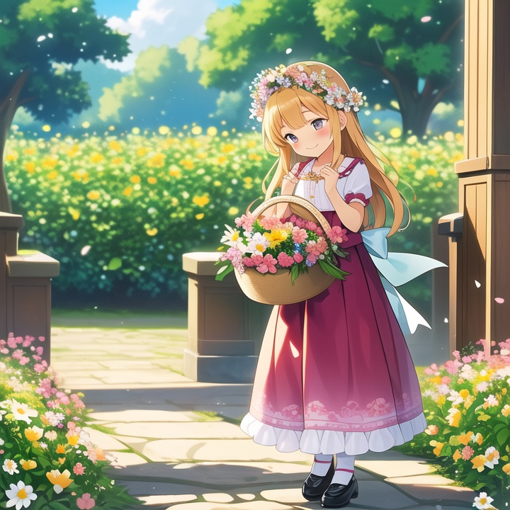 The background of the painting is a lush and vibrant garden,with bright sunshine under a blue sky dotted with white clouds. Various flowers are in full bloom,including charming roses,fresh and elegant daisies,and romantic cherry blossoms. The scent of flowers fills the air. The little girl is dressed in a delicate floral dress,with the hem gently swaying in the breeze. She wears a pair of exquisite leather shoes and has a woven flower wreath on her head,adorned with a few freshly picked flowers. She stands among the flowers,holding a small bamboo basket that is already filled with fresh flowers. She tiptoes to carefully pick a blooming rose,her face beaming with satisfaction and joy. Butterflies flutter around,and bees buzz,as if also appreciating this beautiful scene.,