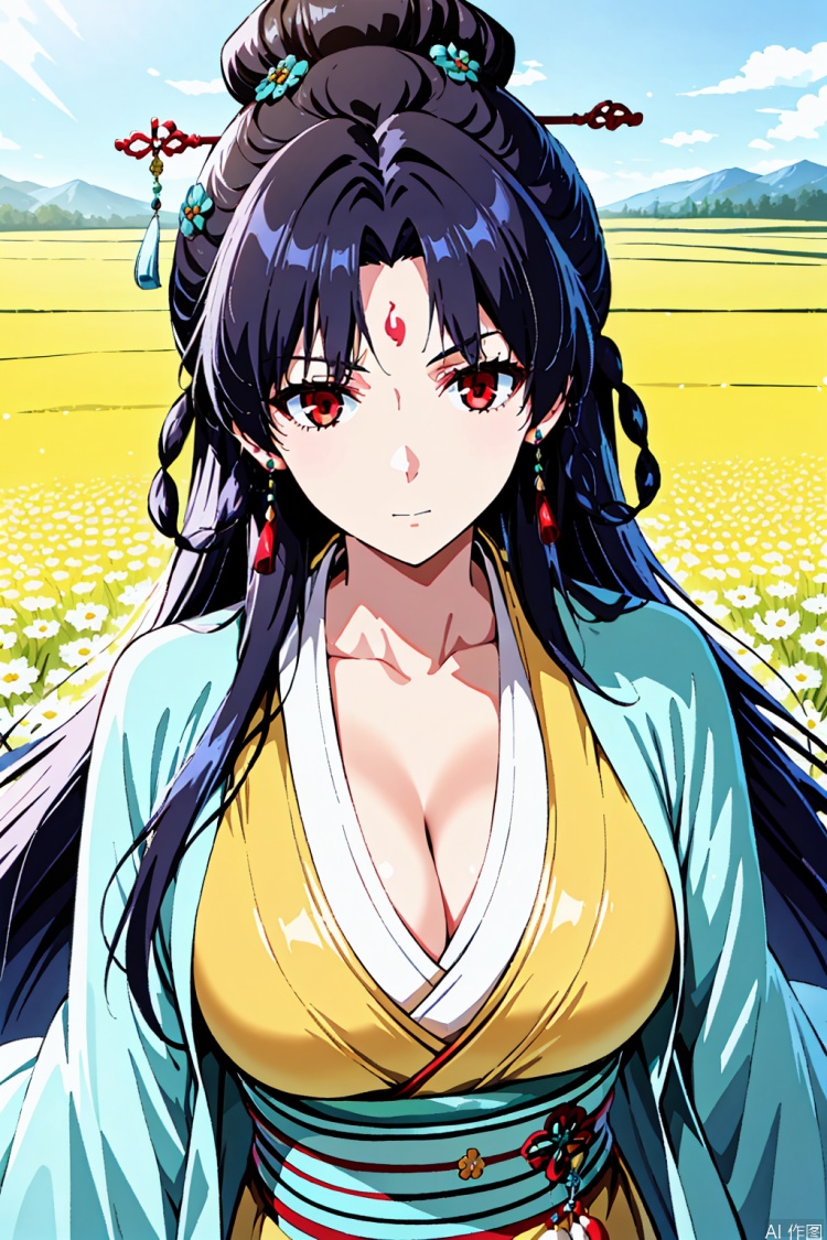 1girl, solo, long hair, breasts, bangs, large breasts, black hair, hair ornament, red eyes, long sleeves, cleavage, jewelry, very long hair, closed mouth, collarbone, earrings, japanese clothes, wide sleeves, parted bangs, sash, facial mark, chinese clothes, forehead mark,hanfu,masterpiece,best quality,official art,extremely detailed CG unity 8k wallpaper,