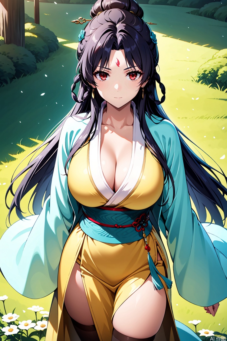 1girl, solo, long hair, breasts, looking at viewer, bangs, large breasts, black hair, hair ornament, red eyes, cleavage, wide sleeves, parted bangs, sash, facial mark, chinese clothes, hanfu,masterpiece,best quality,official art,extremely detailed CG unity 8k wallpaper,