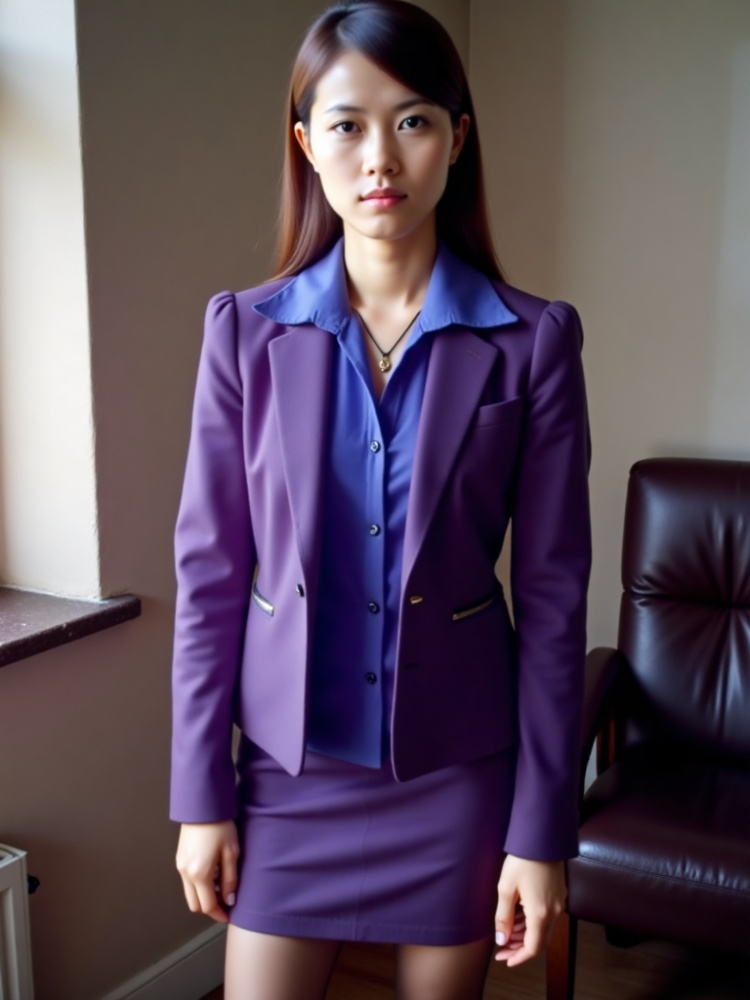(Masterpiece, extreme details, best quality: 1.2, super realism: 1.4, highest definition: 1.4,), (facial details: 1.4, hair details, clear portrait, correct perspective, bright colors), woman, damei, big breasts, D cup, indoors, necklace, (purple pencil skirt, blue turtleneck shirt, purple suit), thighs, black pantyhose, (perfect figure, woman looking at the viewer, seven-point portrait: 1.4, non-half-length portrait: 1.4)