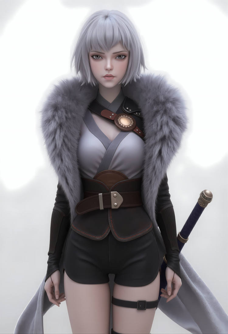 Baiyuekui,the protagonist features pale skin,grey eyes,short silver hair,with a round badge and single pauldrons on the shoulder.,and wears a fur-trimmed coat.,wear a black sleeveless turtleneck top underneath the coat and are equipped with a distinctive belt around the waist.,She is fitted with a pair of high-waisted black shorts.,Her left leg is fitted with a thigh strap,covered with black stockings,and she wears knee guards.,-----可以适度加入其它元素或者放入负面tag,做为泛化的条件权重0.75-0.80
