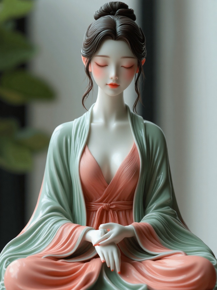 1girl, sitting, solo, closed eyes, breasts, red nails, facing viewer, dress, robe, own hands together, nail polish, blurry, blurry background, colored skin, makeup, red lips, lips, wide sleeves