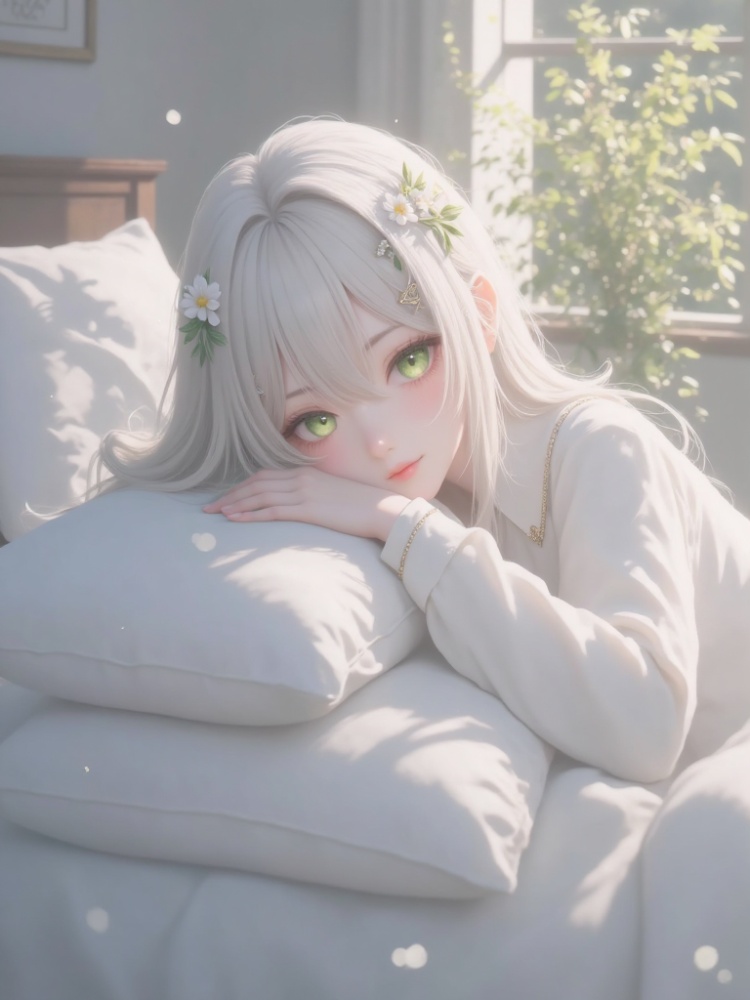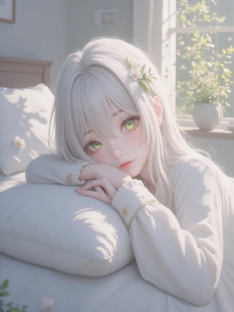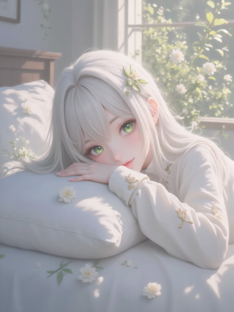 a cartoon girl with long blonde hair, wearing a white long-sleeved shirt, adorned with gold embroidery. Her eyes are a piercing green, and her lips are painted a vibrant red. She is lying on a bed, her arms resting on a white pillow, her head resting on the pillow. The pillow is adorned with a floral design, adding a touch of nature to the scene. In the background, a window is visible, providing a glimpse of natural light.