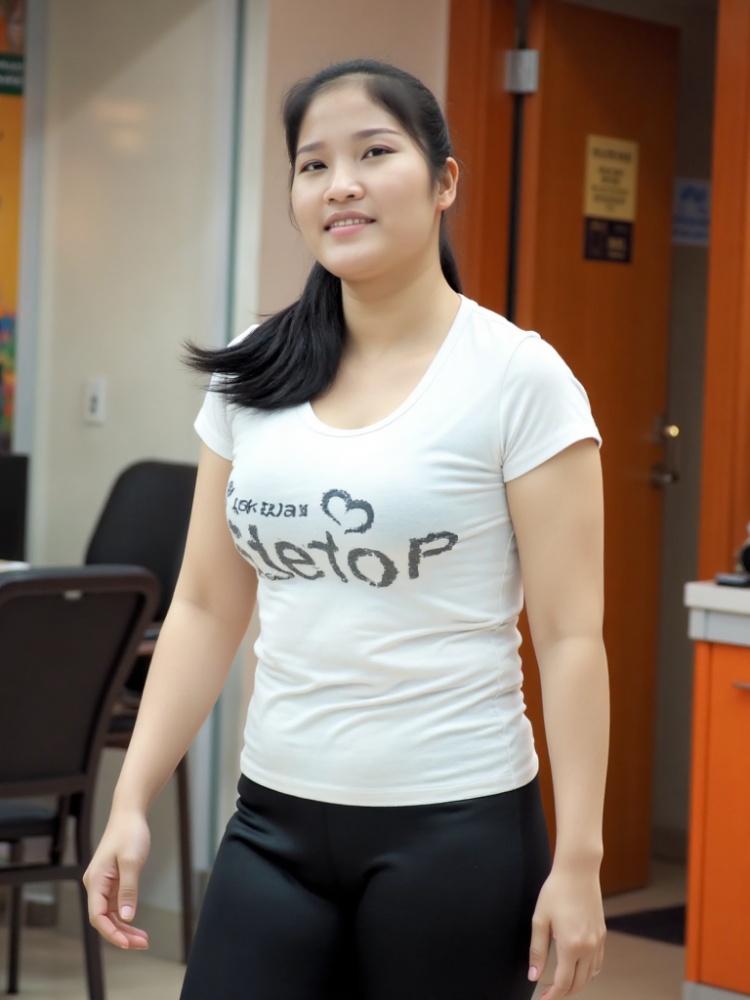 (Masterpiece, Extreme Details, Best Quality: 1.2, Super Realistic: 1.4), (Facial Details: 1.4, Hair Details, Clear Portrait, Correct Perspective, Smooth Light), Woman, zhengyanzhen,Long hair, large breasts, fair skin, indoor, (printed white T-shirt, black tight pants), thighs, buttocks, standing, (perfect figure, fully dissected, full chest shape, seven point portrait: 1.4, not half body portrait)