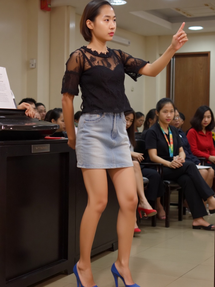 (Masterpiece, Ultimate Detail, Best Quality: 1.2, Surrealism: 1.4), (Facial Detail: 1.4, Hair Detail, Clear Portrait, Correct Perspective, Smooth Light), a girl, zengni,Solo, short hair, medium chest, indoor, (black bra, denim strapless skirt, black lace see through top,) high heels, thighs, (perfect figure, full body structure, woman looking at audience: 1.4, seven point portrait: 1.4, non half body portrait: 1.4)