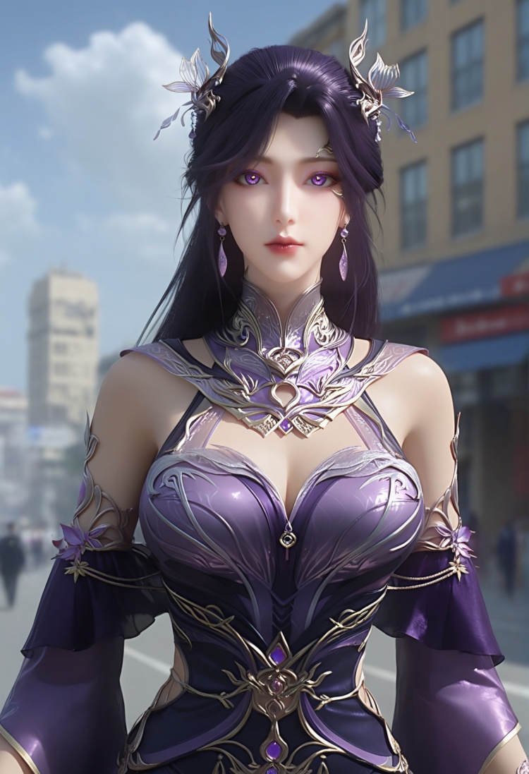 (score_9),<lora:燕倾城-Apony:0.85>,yanqinchen,(mature_female),solo,long hair,hair ornament,purple hair,