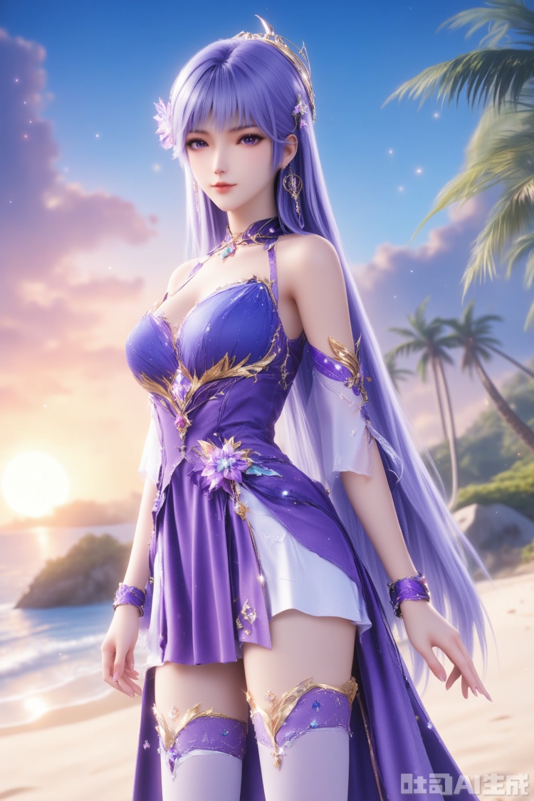 1girl, solo, long hair, breasts, looking at viewer, blue eyes, hair ornament, thighhighs, dress, bare shoulders, jewelry, purple eyes, purple hair, earrings, detached sleeves,purple dress,masterpiece,best quality,official art,extremely detailed CG unity 8k wallpaper,