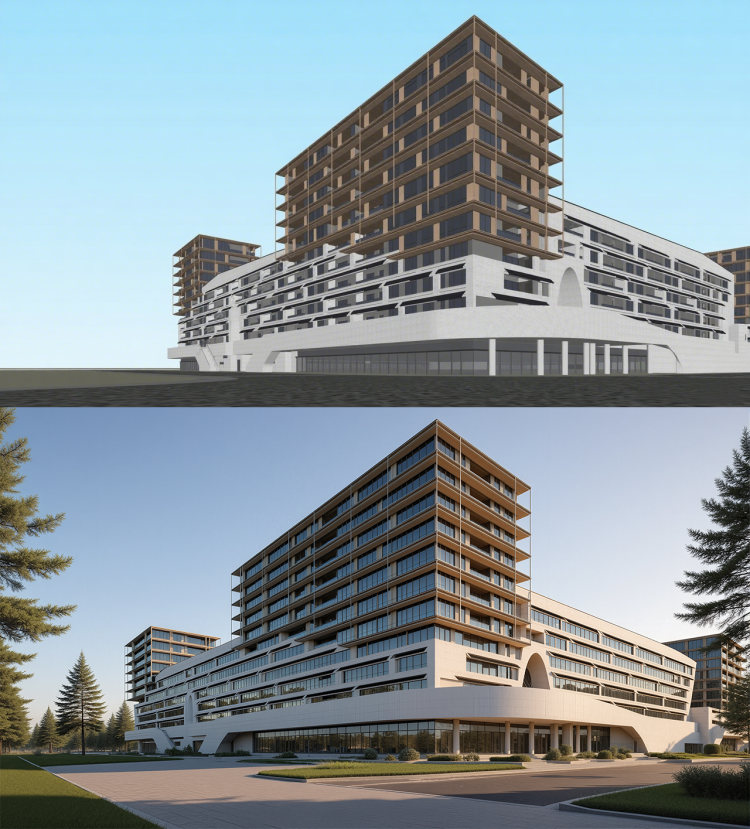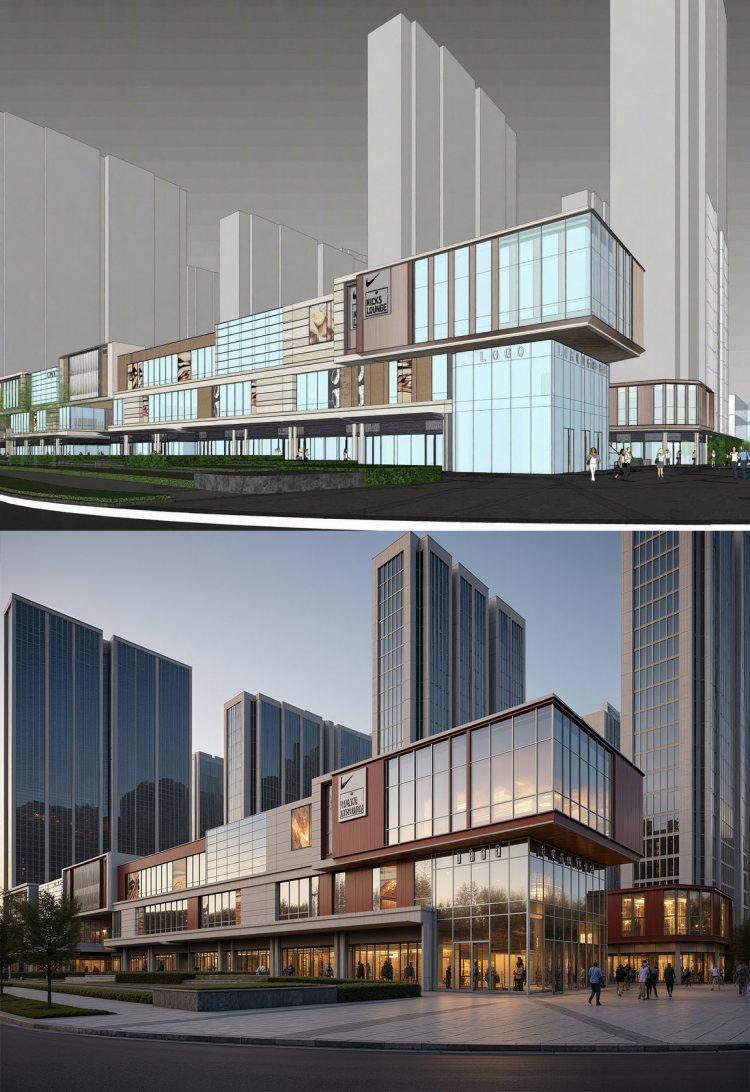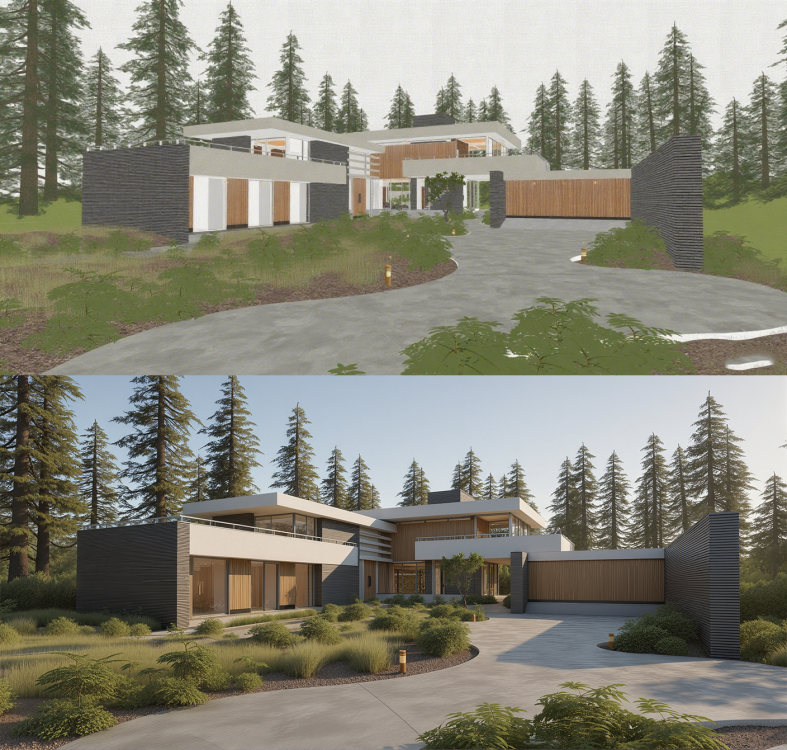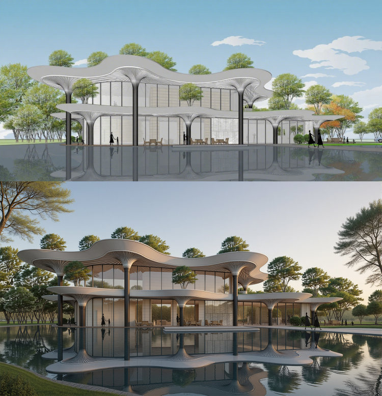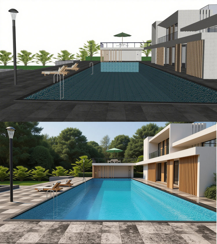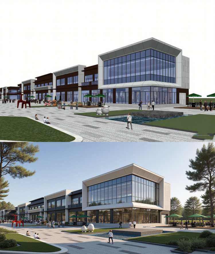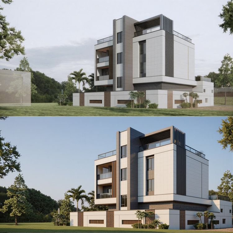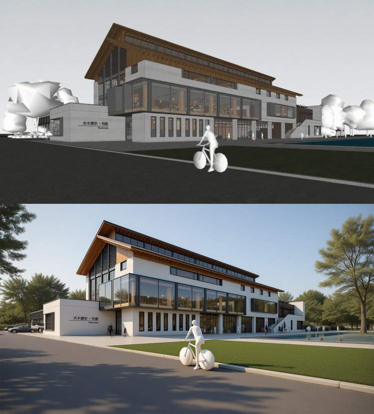 Prompt:Outdoor render effect,realistic photo style,keep the theme unchanged,with sunlight shadows,and real plants on the side. Lighting effect diagram of cold and warm comparison,