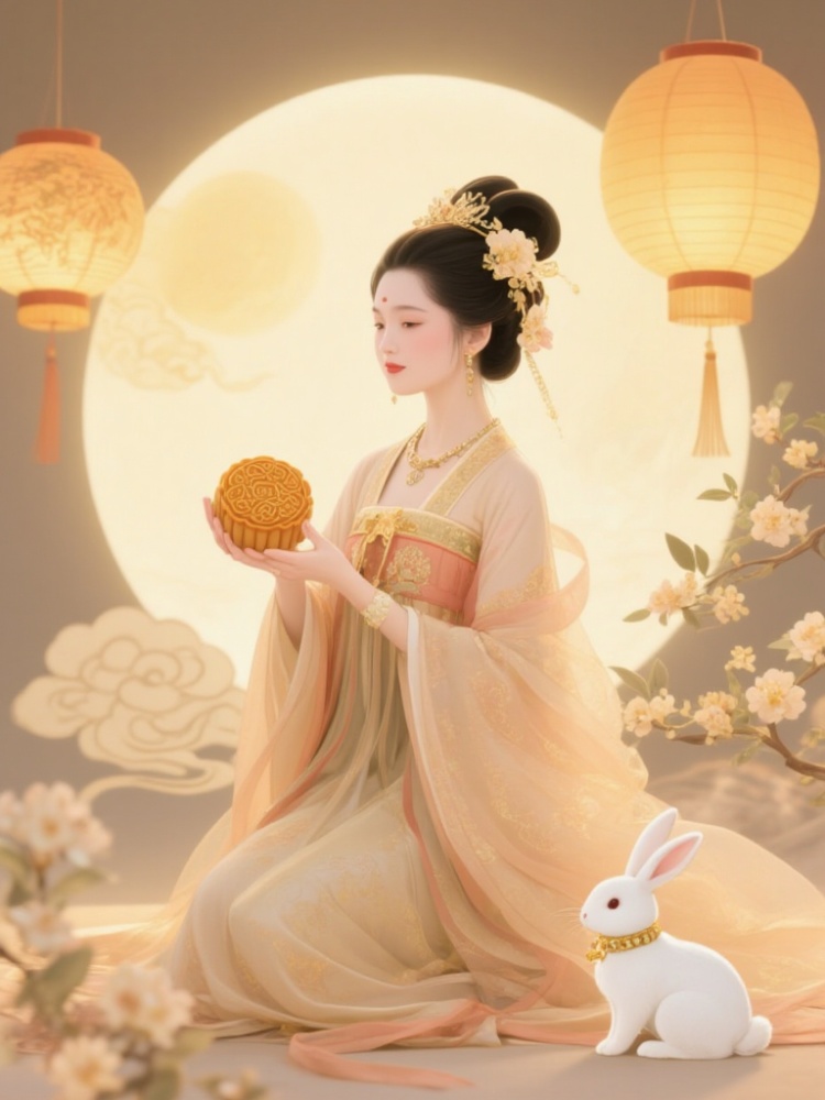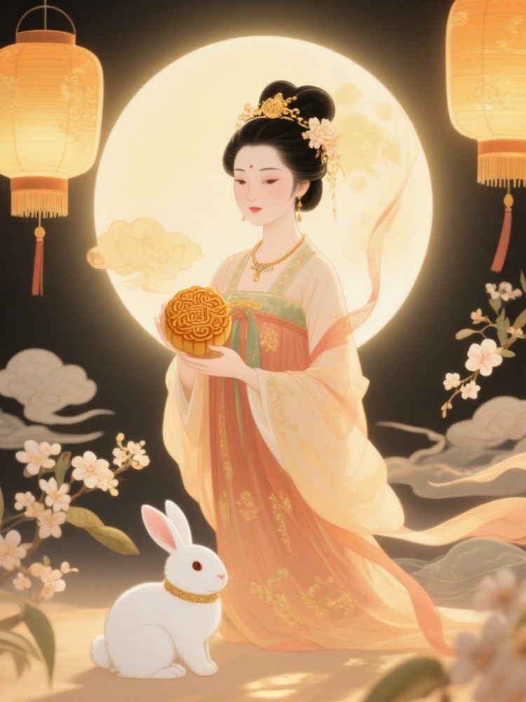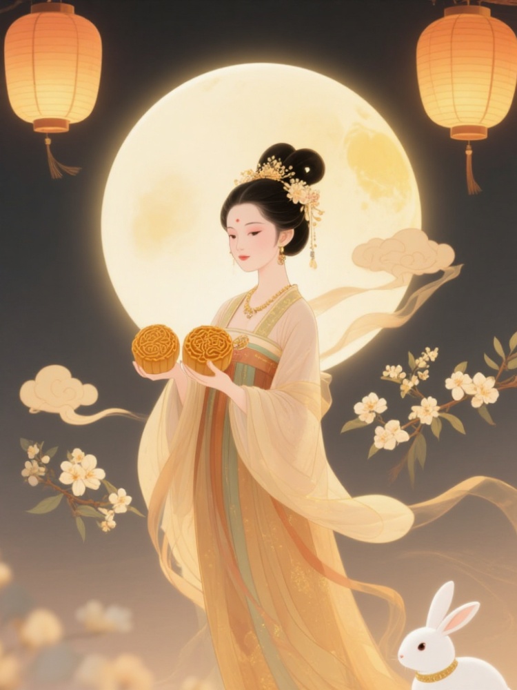 翻译:在海报中心,一轮巨大的金色月亮格外醒目。月亮上装饰着祥云和玉兔等中国传统图案。月亮下方,一家人围坐在圆桌旁。桌上摆放着几盘美味的月饼、新鲜水果以及一壶热气腾腾的茶。家人们开心地笑着,脸庞沐浴在柔和的月光中。在这一场景周围,挂着一些红灯笼,增添了一抹节日色彩。背景是深蓝色的天空,布满闪烁的星星,营造出温馨和谐的中秋氛围。