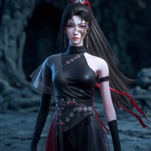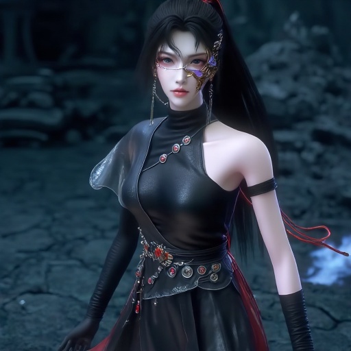 long black hair (high ponytail, adorned with delicate hair accessories),