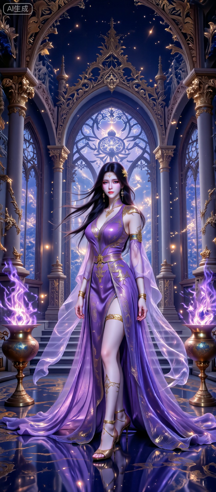 紫宸殿阁间,紫衣神女以金紫为墨,书就宫廷神话的魅惑。紫发如瀑,金饰花钿与紫晶配饰点亮殿阁金柱红栏,紫衣金纹在蕾丝与绸缎的碰撞中,揉碎宫廷雍容与摩登魅惑。她斜倚雕花木椅,似高踞神话殿宇的神女,将皇家气韵与幻想张力熔铸,在国风的奢华维度拓出新境。