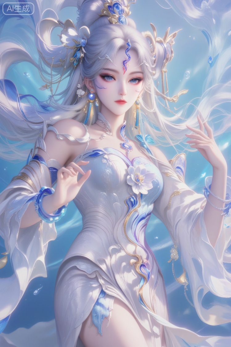 女娲蛇年限定,score_9,score_8_up,1girl, solo, long hair, blue eyes, hair ornament, dress, bare shoulders, jewelry, white hair, earrings, detached sleeves, white dress, bracelet, facial mark, forehead mark,