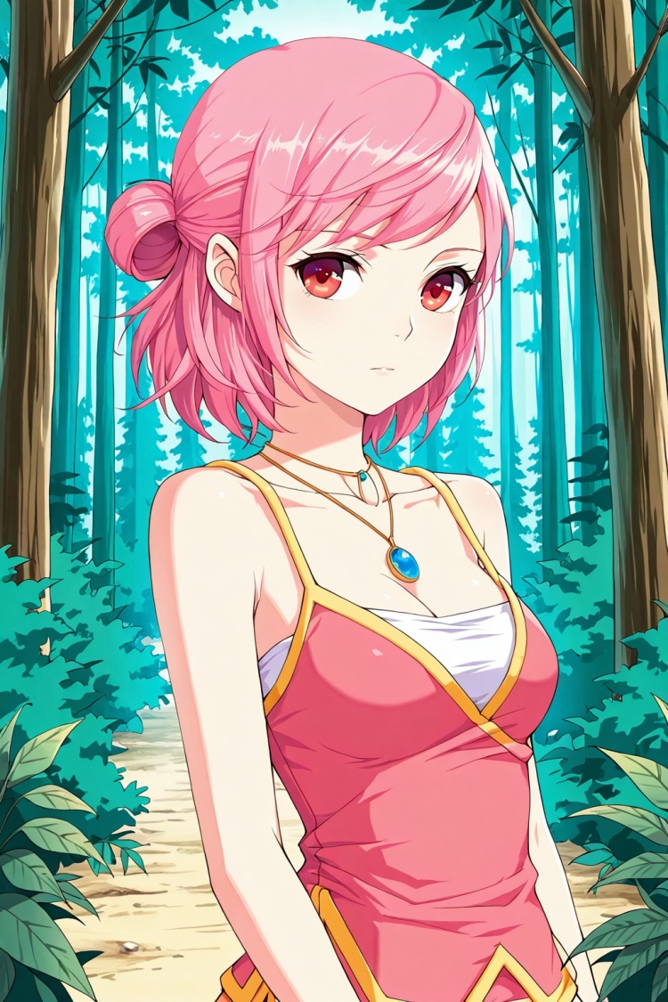萧媚,best quality,amazing quality,1girl, solo, red eyes, pink hair, short hair, hair bun, double bunchinese clothes, dress, short skirt, sleeveless, pendant, jewelry, bare shoulders, cleavage, collarbone,