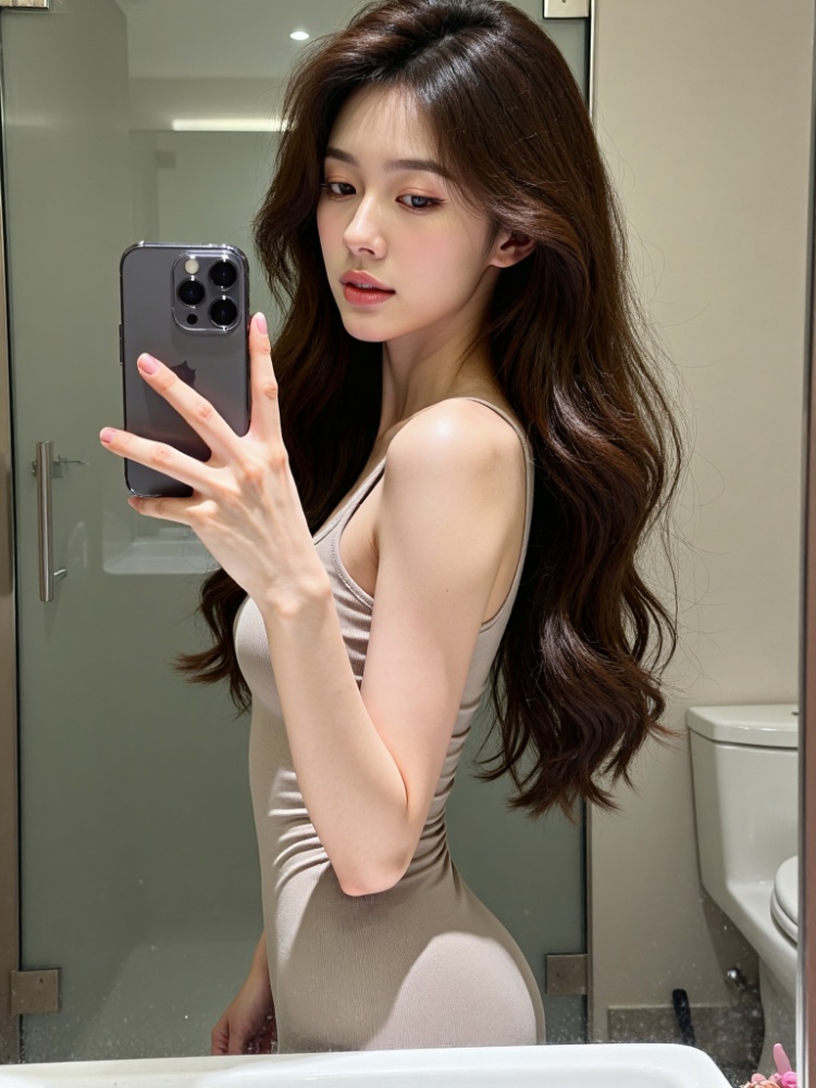 复制提示词同款:Relaxed and beautiful self-portrait in front of the mirror. A long-haired beauty stands with relaxed posture,her waist naturally curved into an S-shape,her shoulders and neck slender and smooth,her legs together with long and elegant lines. Holding an iPhone 15 Pro Max,her arm slightly bent revealing a delicate wrist line. She turns her body slightly to make her shoulder and back lines more gentle. Her clothing fits her body,outlining delicate curves. Her skin is fair and transparent,with natural luster,no heavy makeup effect. Her long hair is smooth and fluffy,with clear layers and slightly curled ends that gently sway with movement. Her facial features are delicate,with soft eyes,long lashes,and a gaze that shifts with a lazy look. Her lips are coated with a transparent lip gloss,and a pseudo-natural makeup (thin eyeliner, light blush) highlights her elegance. Her expression shows a fishing-like pose,natural and not forced,with a slight tilt of the head,an elegant neck curve,and fingers lightly touching the edge of the phone,with slow and subtle movements,carrying a subtle pure desire. The background is a daily bathroom scene,with soft and even lighting,a slightly blurred filter that preserves original texture,a clear mirror reflecting the environment,rich details in the image (hair texture, skin pores, fabric of clothes),a natural and realistic atmosphere,blending soft curves with relaxed daily feeling. There is a small logo in the lower right corner (less than 0.001% of the area),hard to identify,almost invisible,integrated into the theme elements,exquisite details,appropriately blended into the image according to the image tone.,