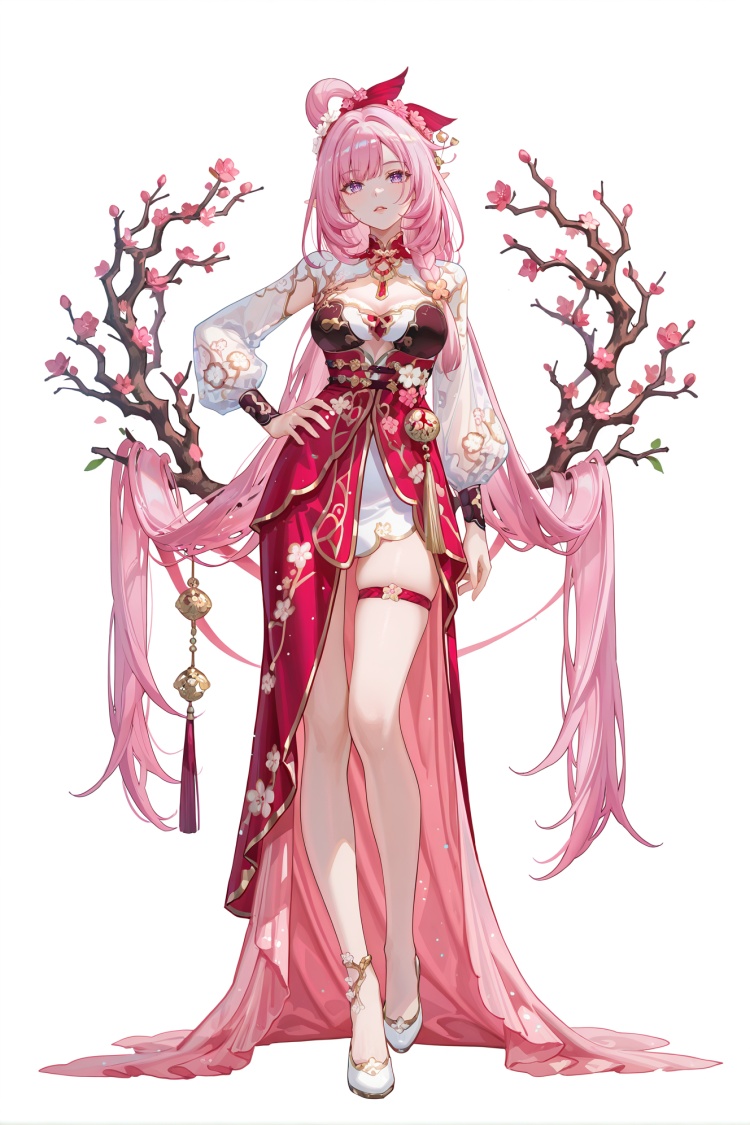 elysia \(honkai impact\),Elysiacn,clothes: Elysiacn red-and-pink chinese dress,Elysiacn hair ornament,1girl,pink hair,pointy ears,breasts,long hair,elf,purple eyes,flower,bangs,hair flower,diamond-shaped pupils,Peach branch with peach blossom,asymmetrical dress,