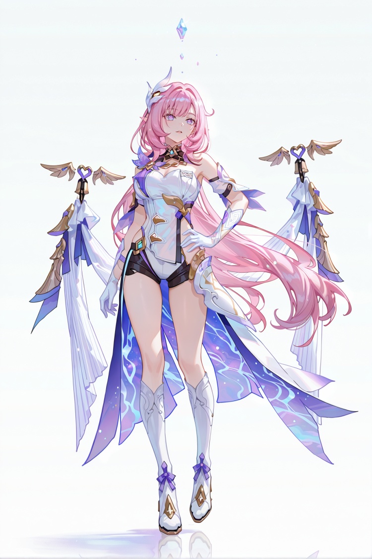 elysia \(honkai impact\),Elysiaren,clothes: Elysiaren white-and-purple dress,shorts,double Elysiaren floating bells,1girl,pink hair,long hair,white gloves,bangs,Elysiaren boots,bare shoulders,white footwear,Elysiaren hair ornament,diamond-shaped pupils,floating ribbon,