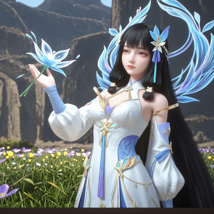 1girl,black hair,hair_ornament,bare shoulders,china_dress,detached_sleeves,white dress,halo,flower,