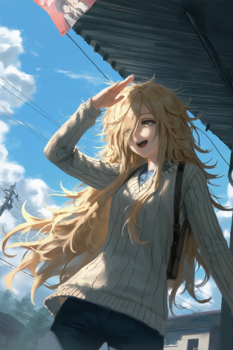 糀谷冬音:Fuyune Kōjiya, 1girl, blonde hair, solo, phone, long hair, messy hair, cellphone, smile, holding, holding phone, sweater, turtleneck, yellow eyes, eyes visible through hair, white sweater, hair over one eye, smartphone, looking at viewer