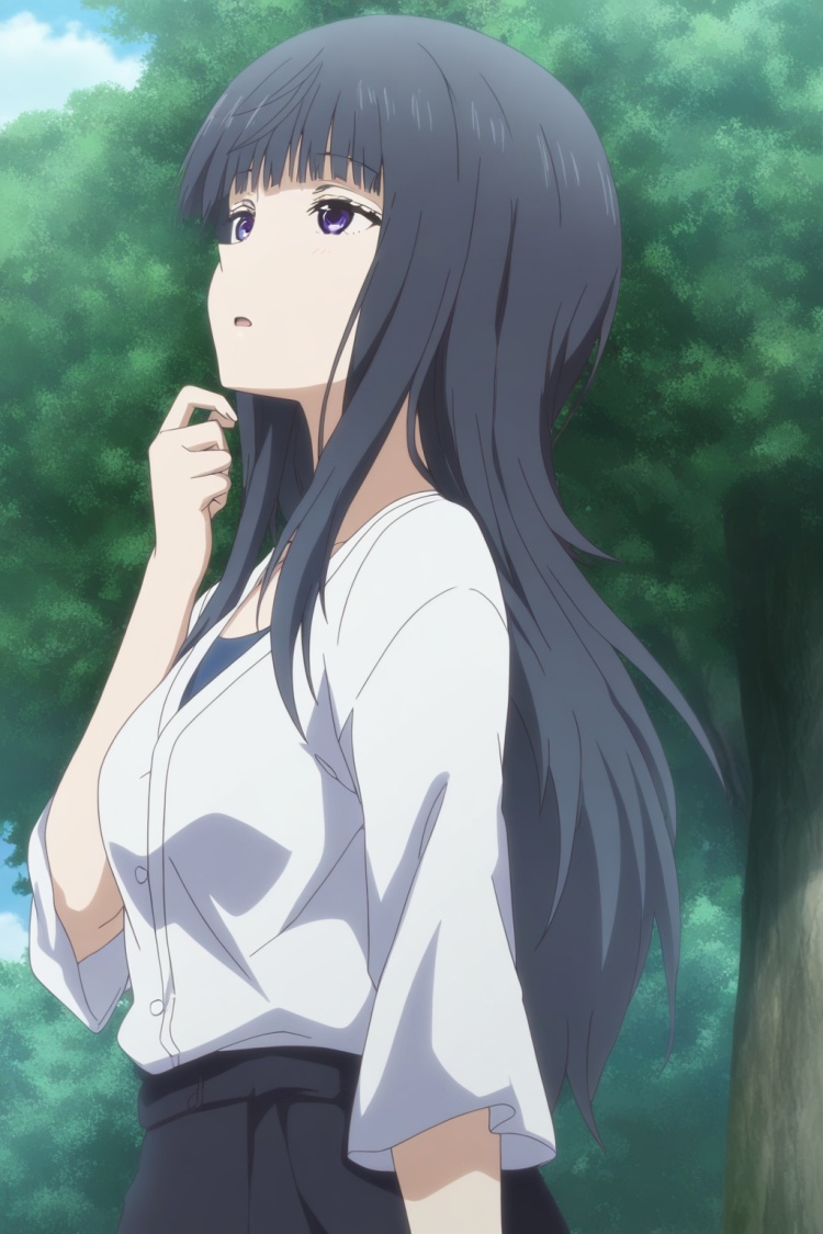 天空桥莉莉:Riri Tenkūbashi, 1girl, solo, purple eyes, black hair, anime coloring, long hair, outdoors, open mouth, upper body, looking at viewer, brown jacket, jacket