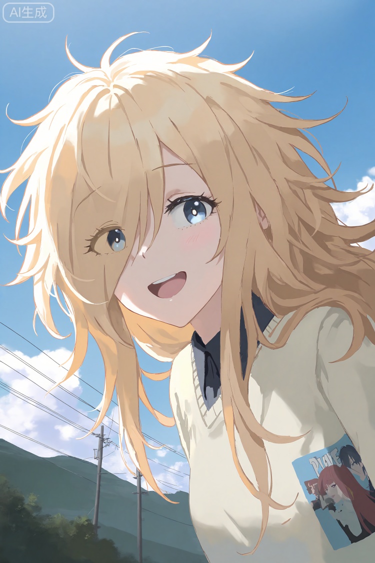铃森千花:Chika Suzugamori, 1girl, blue hair, blue eyes, solo, hat, open mouth, beret, sweater, outdoors, looking at viewer, white sweater