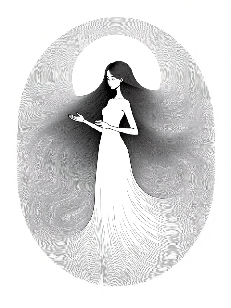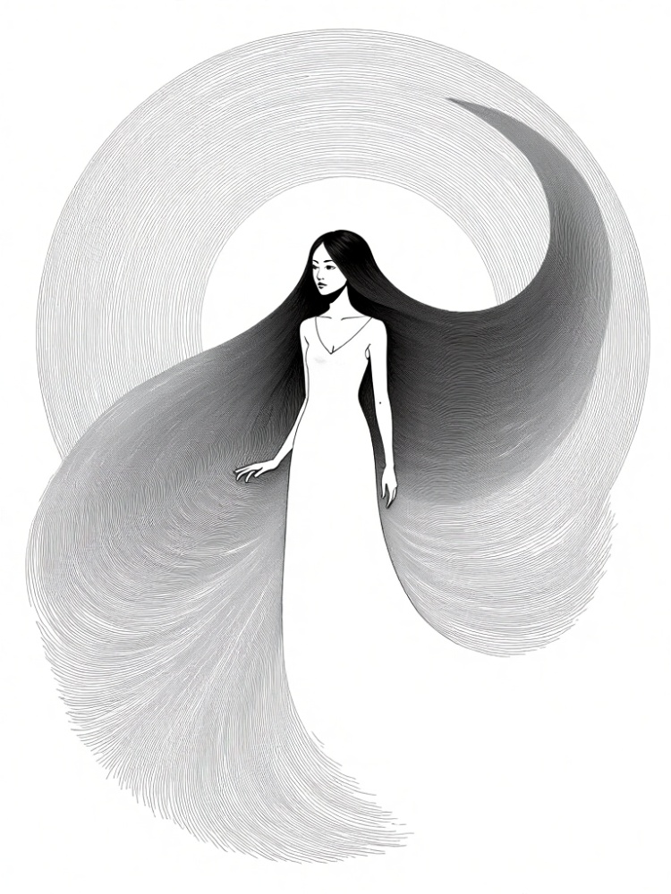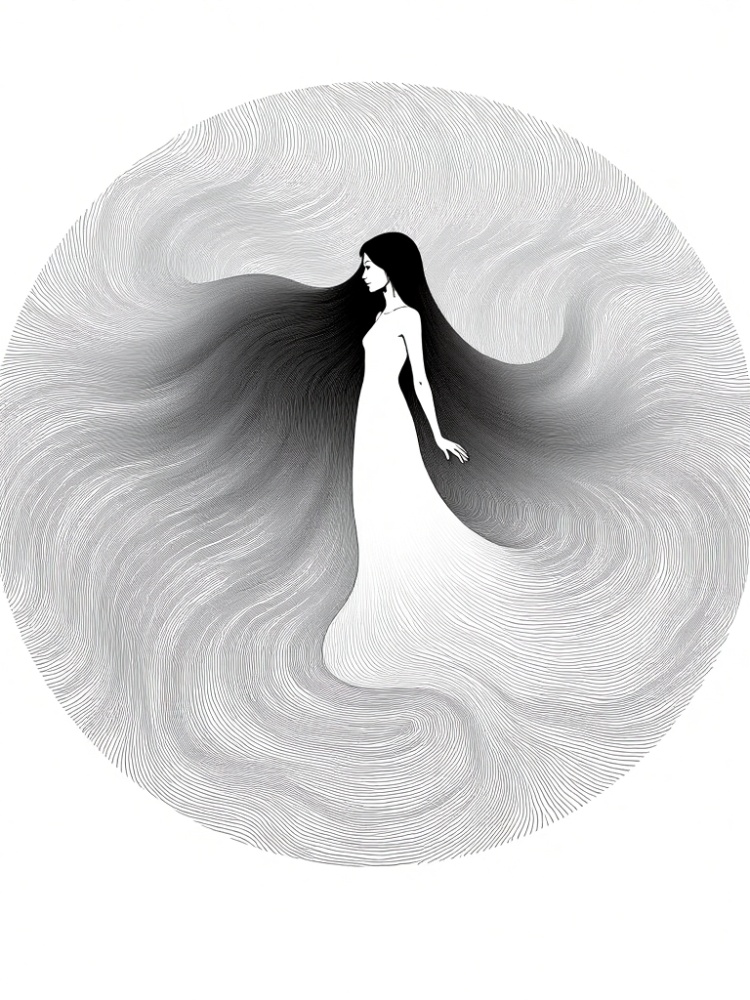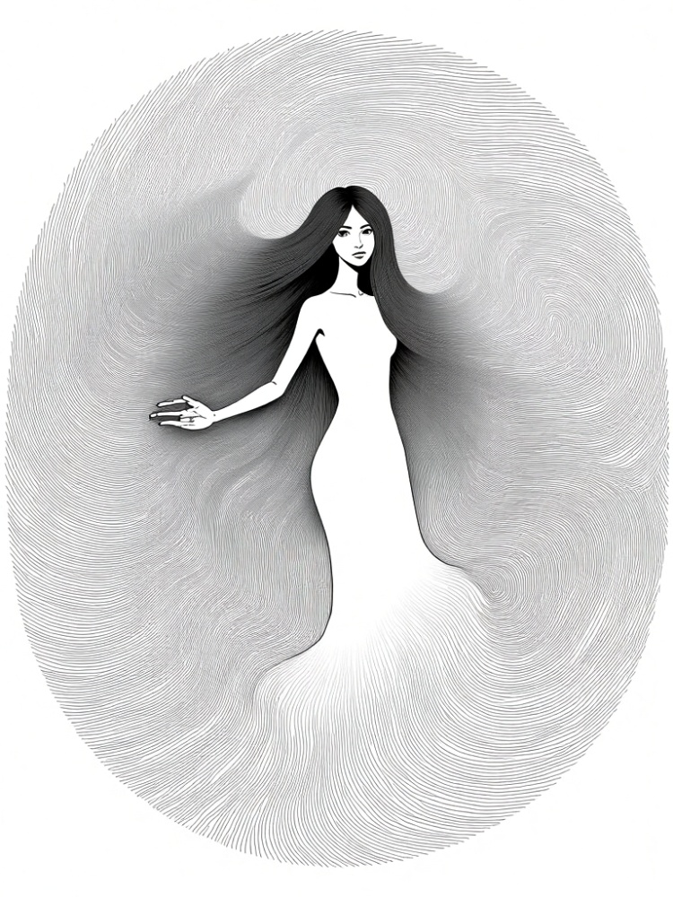 SK, A girl whose long hair seamlessly blends with the background line, creating elegant lines. The background features complex wavy patterns, creating a sense of dynamism and depth. This style is minimalist, emphasizing fine lines and textures. Drawing with black and white lines, the lines are delicate and layered, presenting a simple yet exquisite artistic style. The woman is located in the center of the picture, and the background is a circular pattern composed of dense lines, forming the visual focus.,