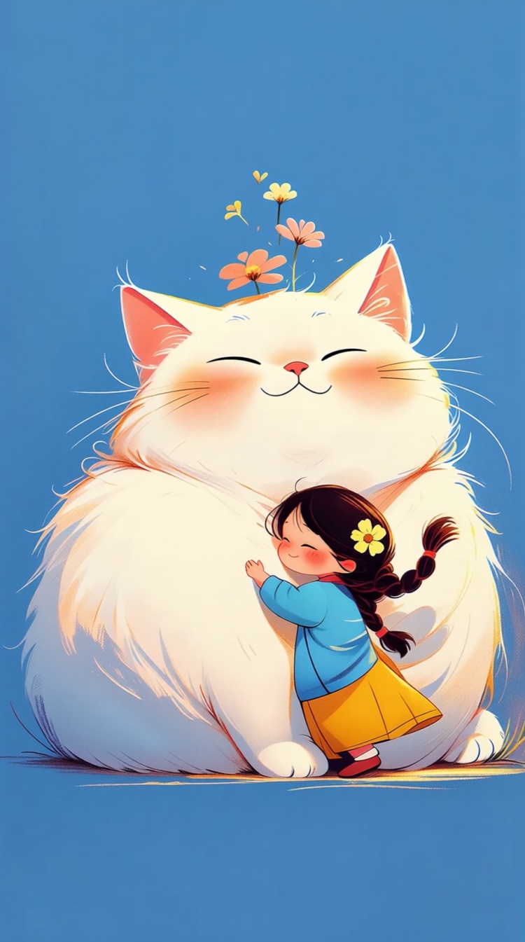 This illustration depicts a warm and healing scene. In the image, a large, fluffy white kitten with light orange on its cheeks has its eyes closed and a smiling mouth, radiating complete contentment, with a few flowers representing happiness floating above its head. A little girl with braided hair and a flower tucked behind her ear, wearing a blue top and a yellow skirt, kindly embraces the kitten, her face showing a relaxed and satisfied expression. The pure blue background further enhances the sincere and warm emotions between humans and animals, conveying a sense of total safety and joy.