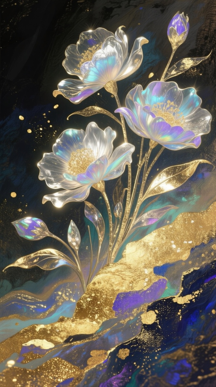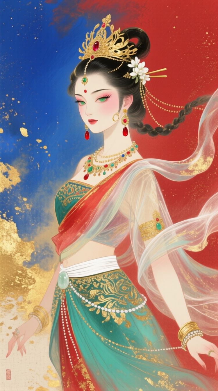A digital illustration captured from a frontal camera angle of a beautiful Asian woman dressed in traditional clothing adorned with golden and colorful ribbons, standing in the center of the image. The woman, who appears to be in her early twenties, has black hair styled in an elegant updo, decorated with a golden hairpiece and earrings. She is wearing a green and gold hanbok with intricate gold embroidery and a matching kimono with a red sash. Her hands are clasped together in front of her, and she has a serene expression on her face, with her eyes closed and her lips painted with a subtle red lipstick. The background features a gold and blue abstract pattern with flowing ribbons in various colors, creating a sense of movement and energy.
