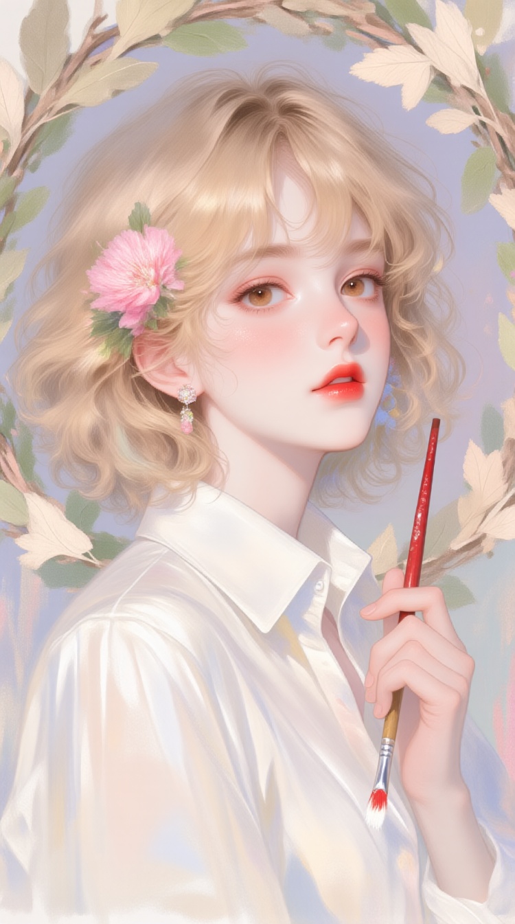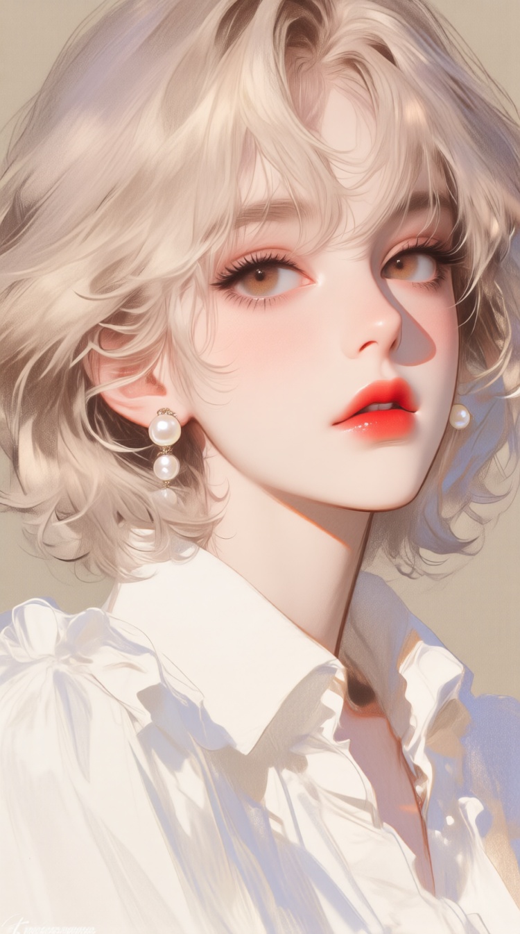 A young woman with brown curly hair, wearing orange lipstick, dressed in a red puffed-sleeve shirt, and wearing pearl earrings, is lying back against a light-colored wall with shadows cast on it. The lighting in the scene is soft and natural, creating a peaceful atmosphere. At the center of the frame is a 20-year-old fair-skinned woman with brown hair and orange eyes, seemingly looking calmly at the viewer. She has a slender figure, her mouth closed, her hair loosely wavy and draped over her back, wearing orange lipstick and earrings. The woman is positioned at the center of the frame, upper body visible, against a simple beige wall, with the shadows adding to the overall serene and tranquil feeling.
