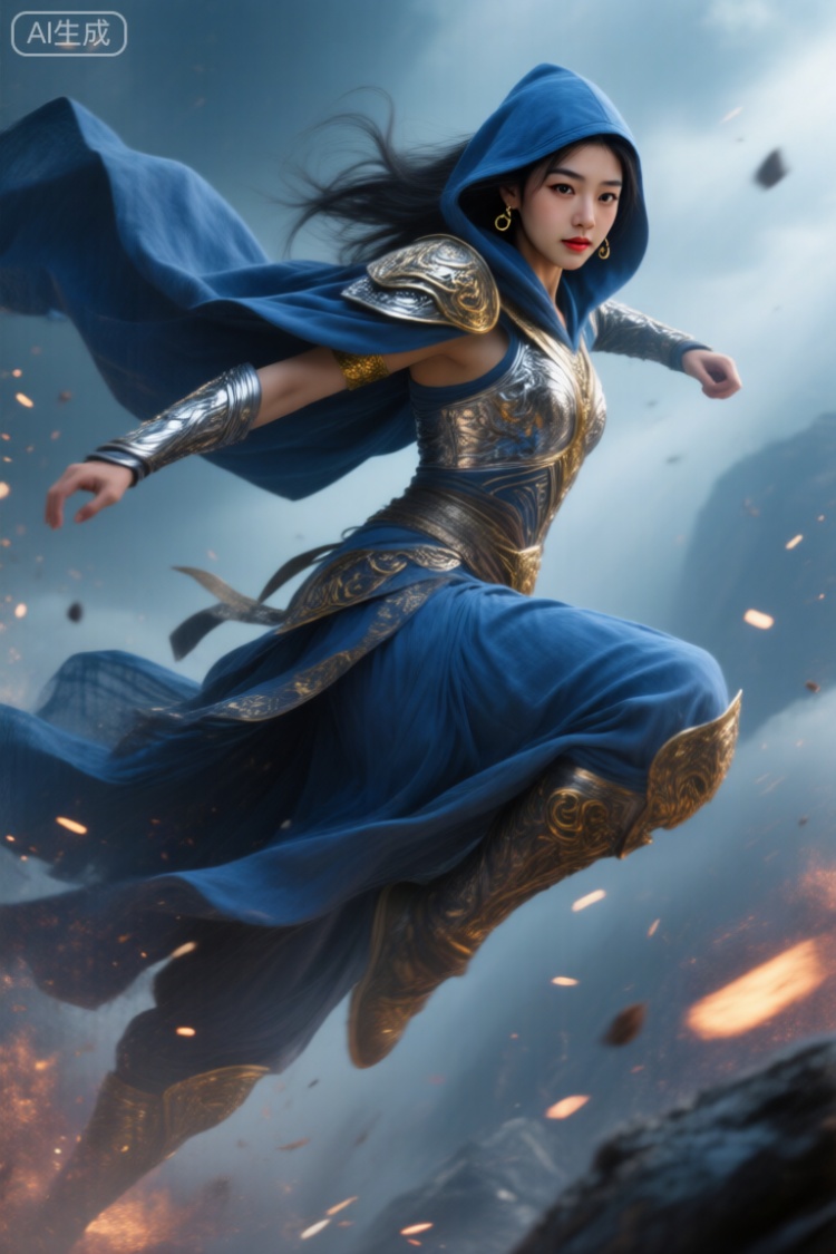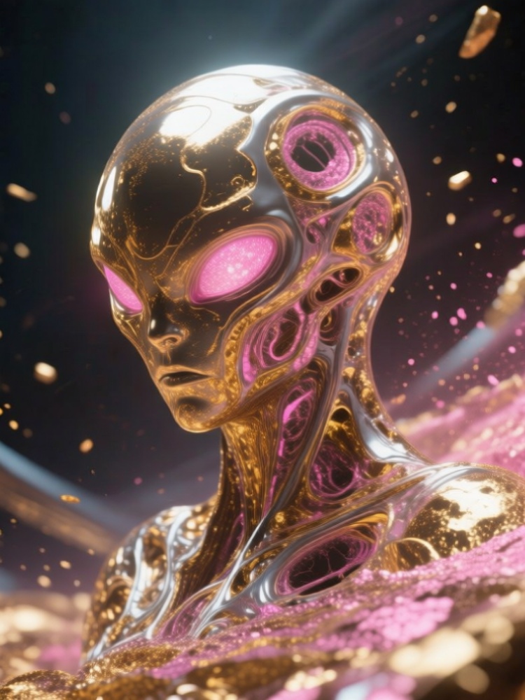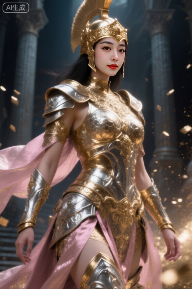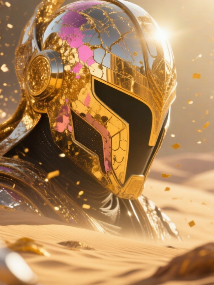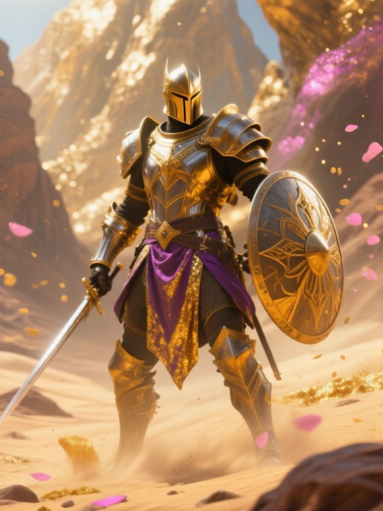 this is a highly detailed, photorealistic cgi image of a armored warrior, the warrior is clad in reflective, gold-plated armor with intricate designs, including a hooded cloak, the armor is partially covered by a gray fabric, and a maroon sash is wrapped around the waist, the helmet, also gold-plated, obscures the face, giving an enigmatic appearance, pink petals are floating around, adding a dynamic, almost magical element, the background is dark and blurred, focusing attention on the warrior, the overall style is fantasy, with a mix of medieval and futuristic elements, emphasizing opulence and mystery