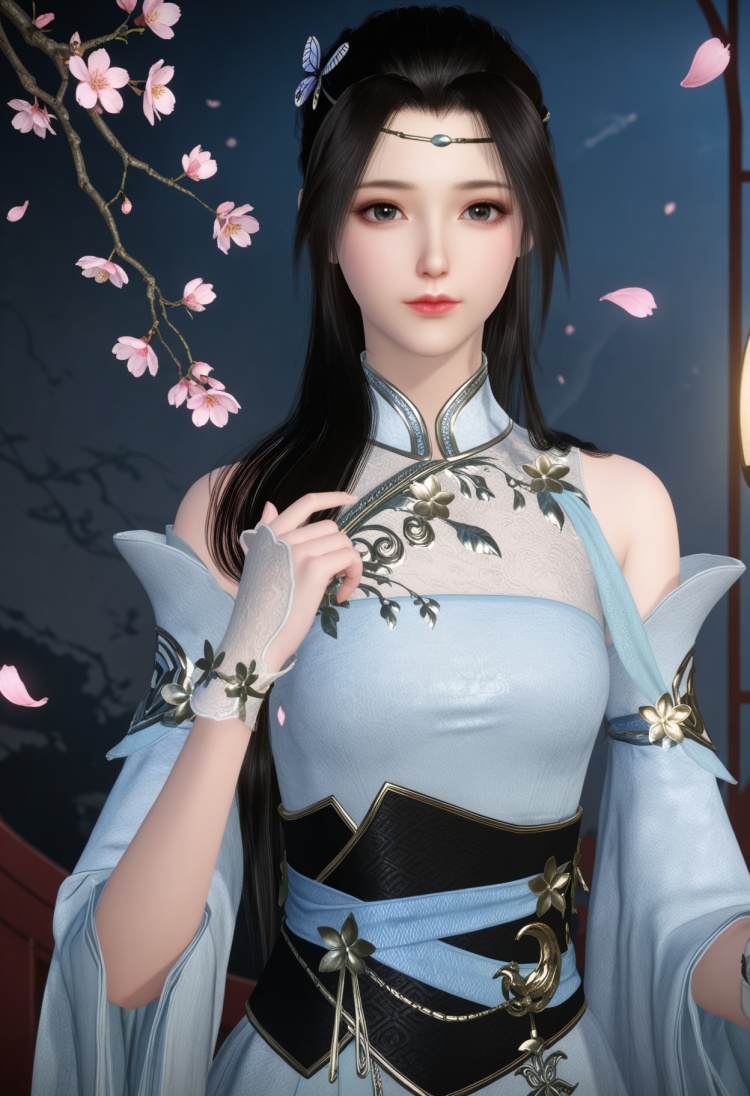 q1528437228,1girl,solo,long hair,black hair,dress,hair ornament,white dress,chinese clothes,detached sleeves,sash,butterfly hair ornament,jewelry,brown hair,bracelet,circlet,black eyes,wide sleeves,long sleeves,obi,white footwear,