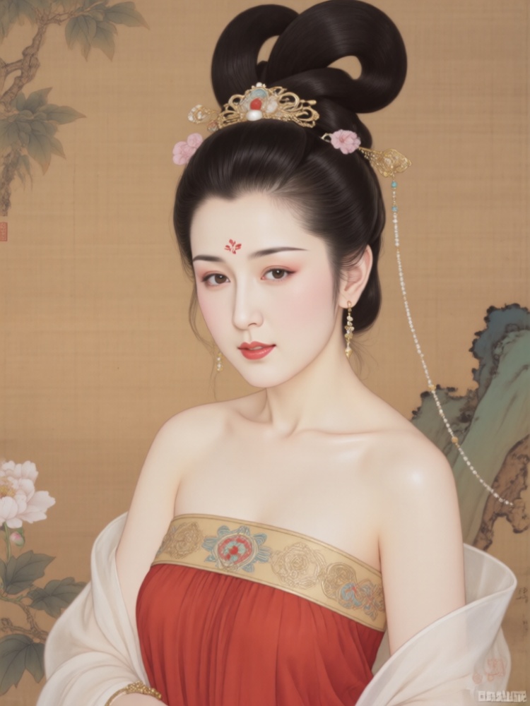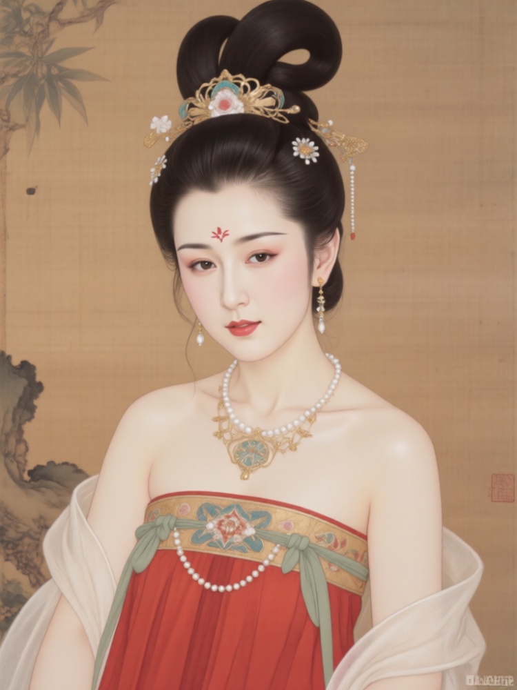 Create a hand-painted portrait of Princess Nanyang, the Sui Dynasty princess, capturing her unique charm as a royal sister and beauty. The painting should feature her in a crimson skirt, with an exaggerated updo and a towering bun, making her appear bright, elegant, classical, and dignified. Incorporate Sui Dynasty elements into her clothing, giving it a distinct and unique style that reflects the richness of the era. Ensure her upper body fills the entire screen, showcasing her fair and shiny skin, and creating a sense of pure and classical beauty. The composition should evoke a strong Chinese style atmosphere, emphasizing the elegance and grace of the Sui Dynasty.