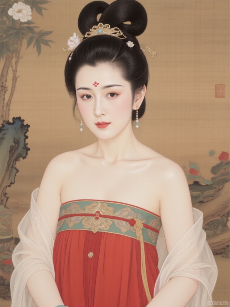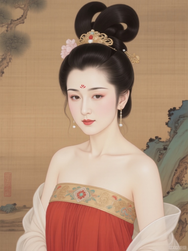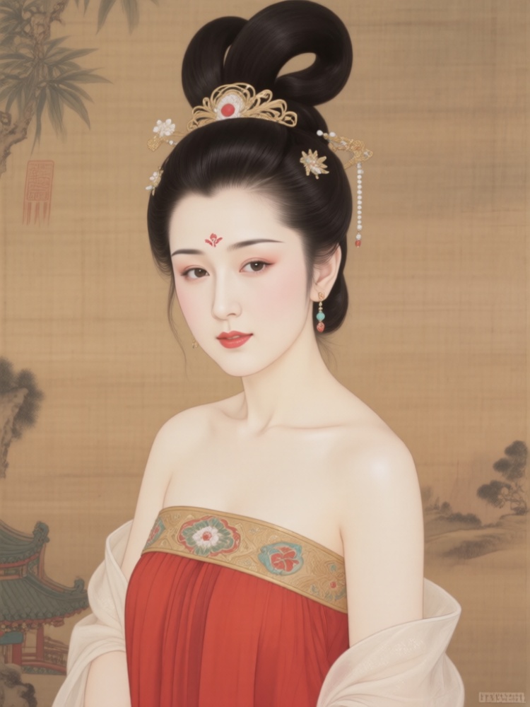 Create a portrait of a noble and glamorous woman with cold fair skin and peach blossom eyes with upturned lids, adorned with earrings and a beautifully embroidered bikini. Her short dark brown hair is gently blown by the wind, framing her delicate face with a high nose bridge, fair and transparent skin, long eyelashes with obvious lying cicadas, exquisite eyeliner, and natural blush on her cheeks. She has a gourd-shaped figure, with a large bust, a slender waist, thin, wide, and round hips, and shiny skin.