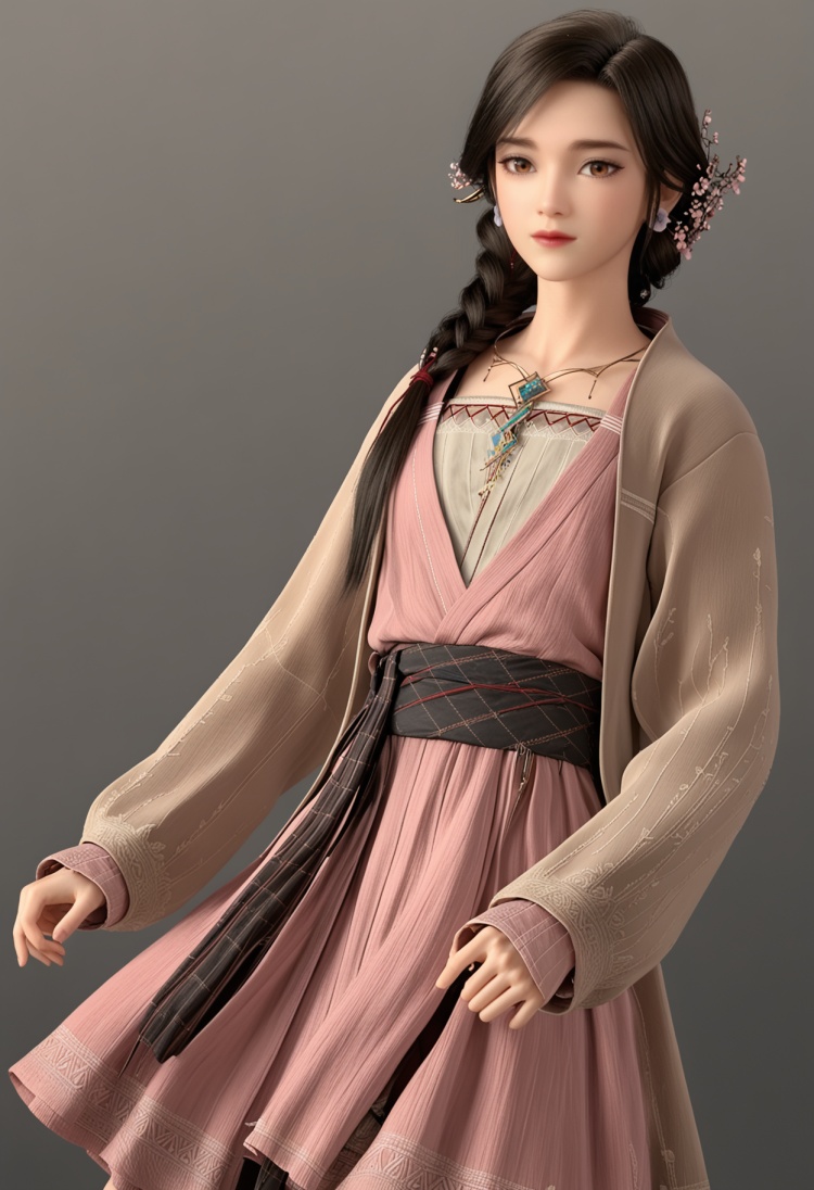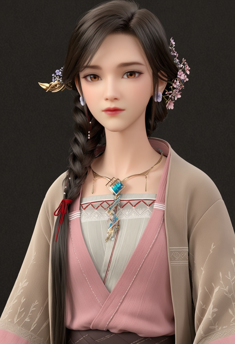 <lora:YQ_pony_yingmo_V4:0.8>,q1528437228,1girl,solo,jewelry,long hair,hair ornament,earrings,braid,brown hair,brown eyes,hair flower,necklace,black hair,dress,long sleeves,single braid,
