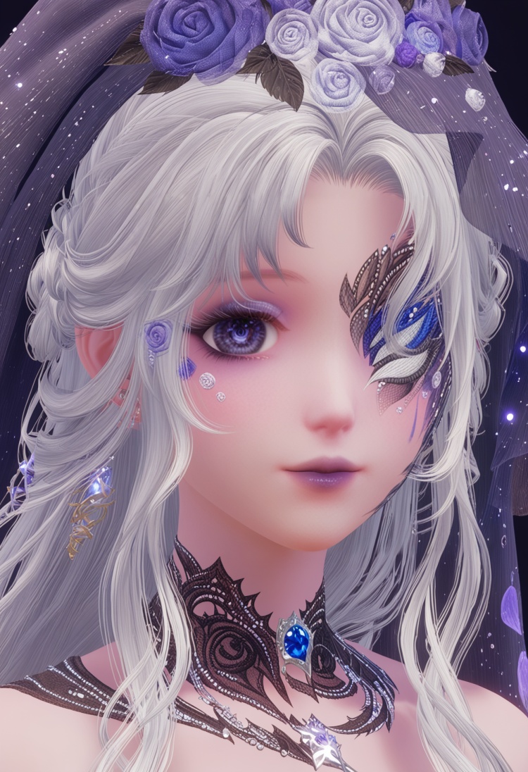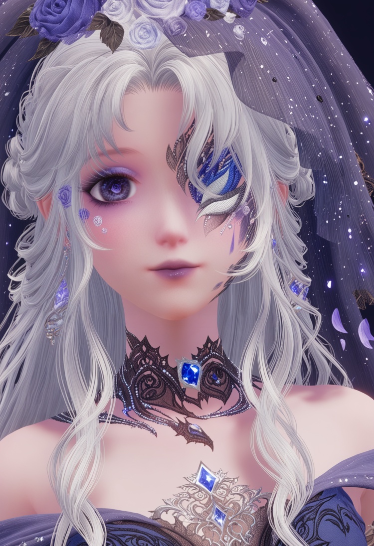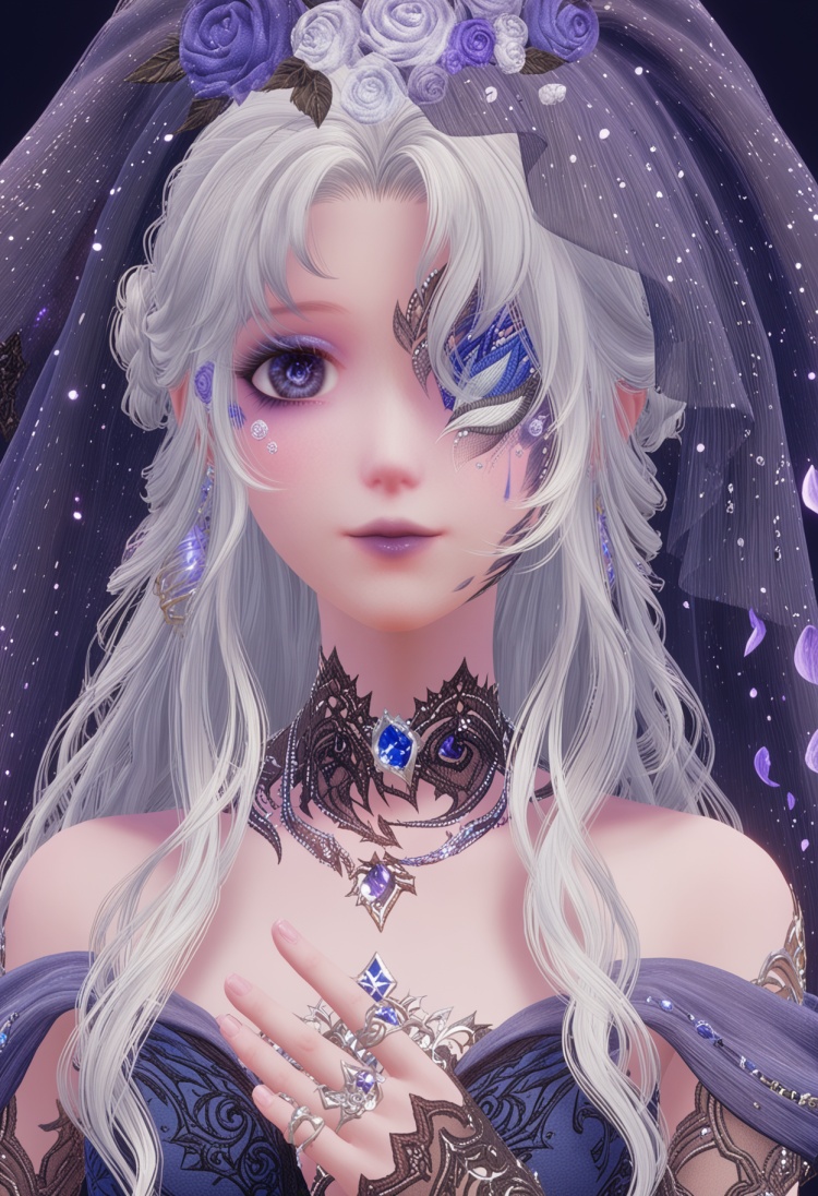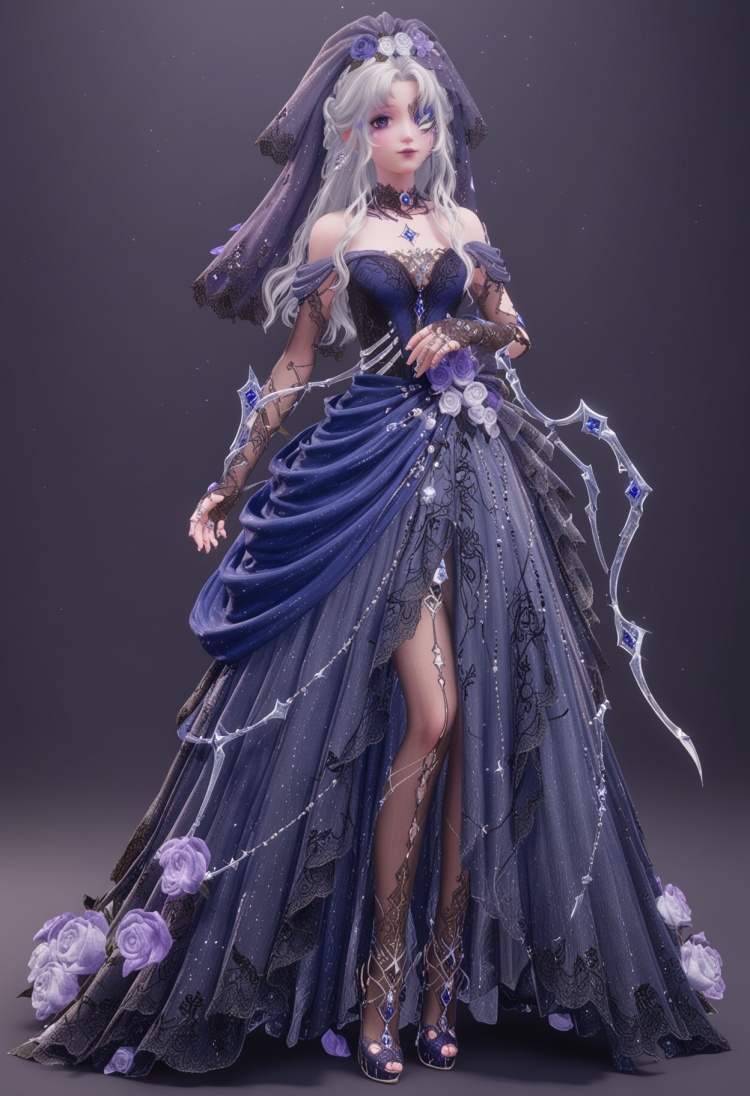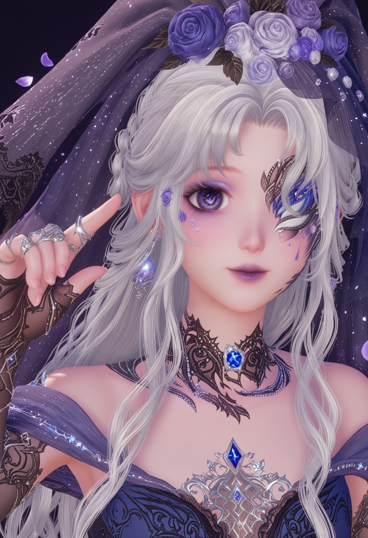 <lora:YQ_pony_nuannuan36_V4:0.8>,q1528437228,1girl,solo,jewelry,long hair,white hair,purple eyes,dress,hair flower,hair ornament,makeup,earrings,gloves,ring,eyepatch,petals,purple lips,bridal gauntlets,pointy ears,blue eyes,grey hair,high heels,one eye covered,choker,pantyhose,long dress,bridal veil,fingerless gloves,necklace,fine fabric emphasis,bow,braid,eyeshadow,