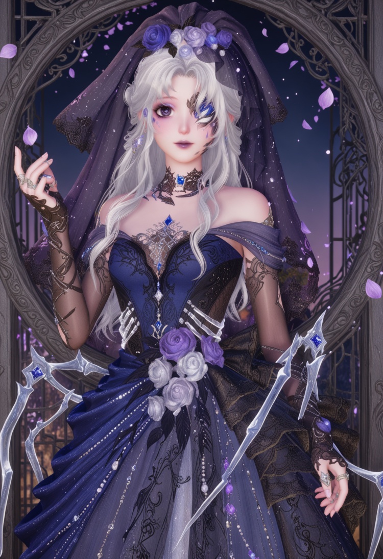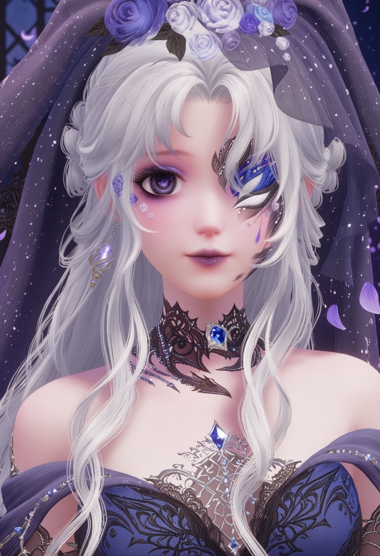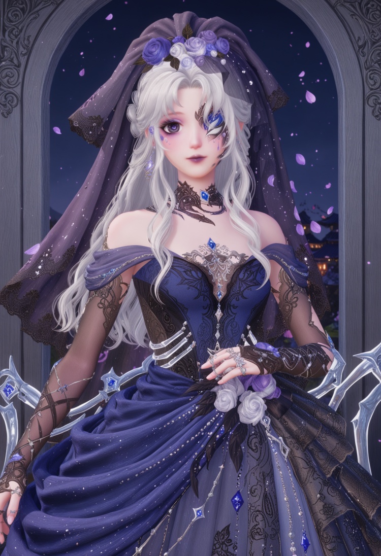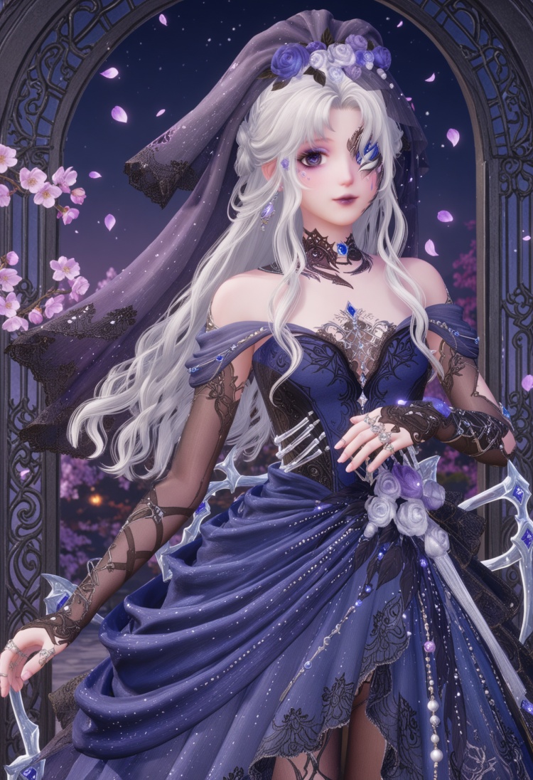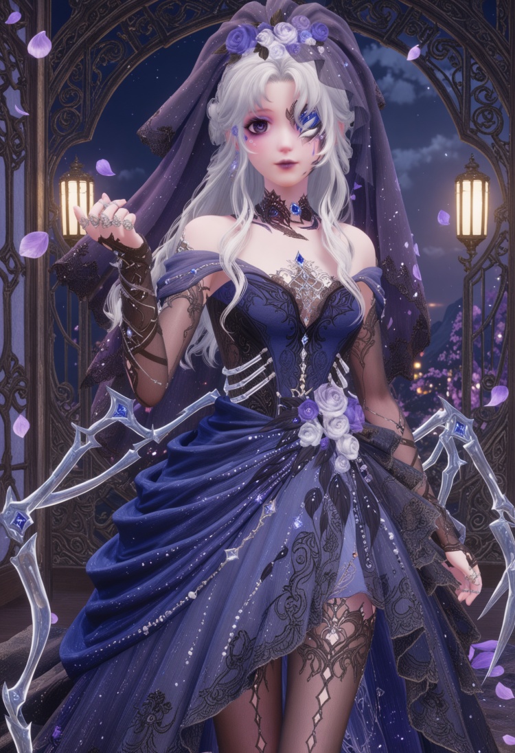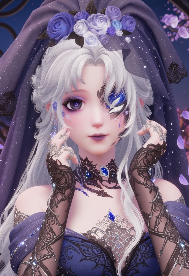 q1528437228,1girl,solo,jewelry,long hair,white hair,purple eyes,dress,hair flower,hair ornament,makeup,earrings,gloves,ring,eyepatch,petals,purple lips,bridal gauntlets,pointy ears,blue eyes,grey hair,high heels,one eye covered,choker,pantyhose,long dress,bridal veil,fingerless gloves,necklace,fine fabric emphasis,bow,braid,eyeshadow,