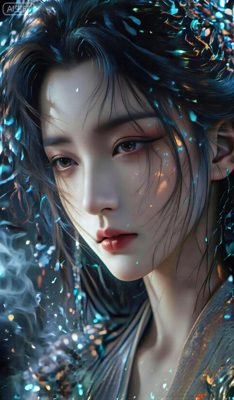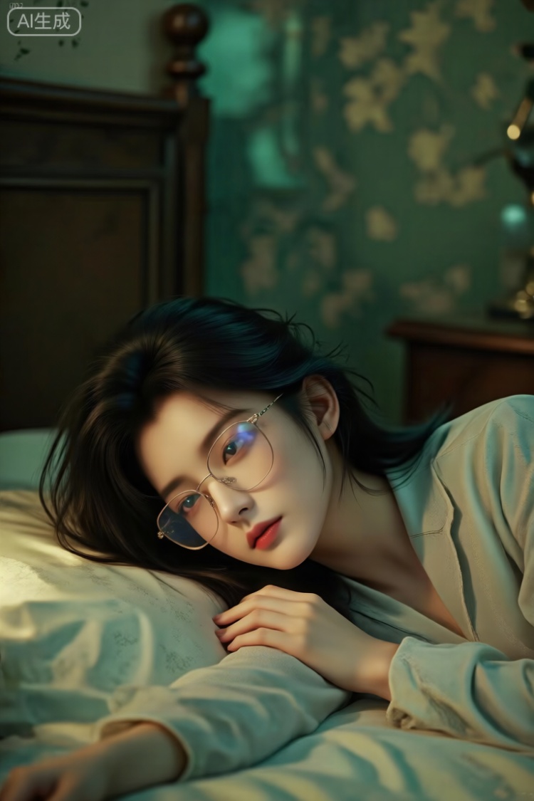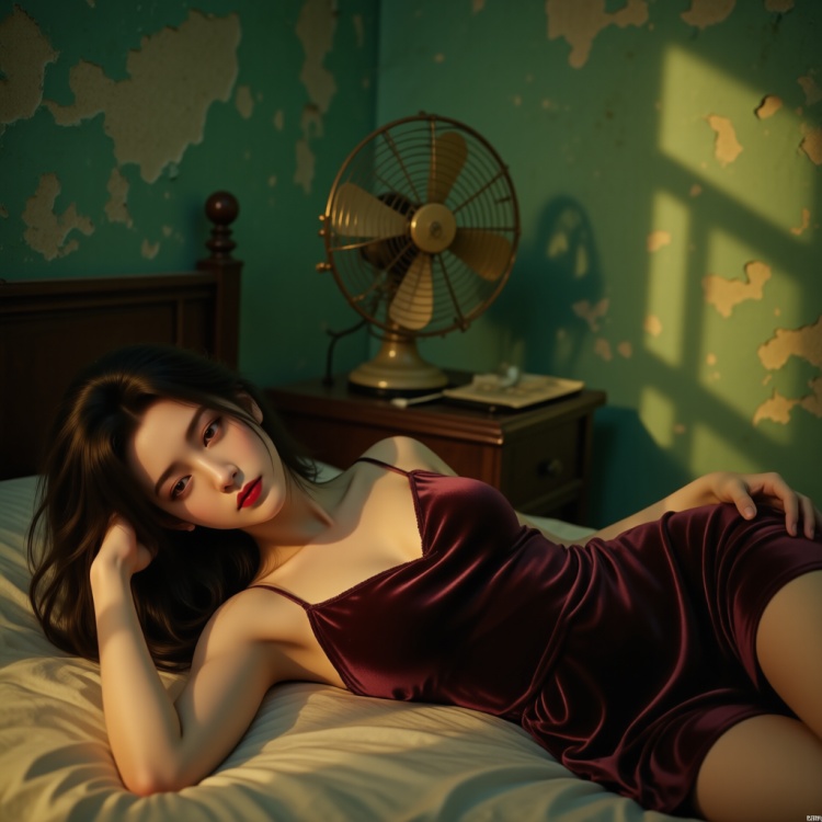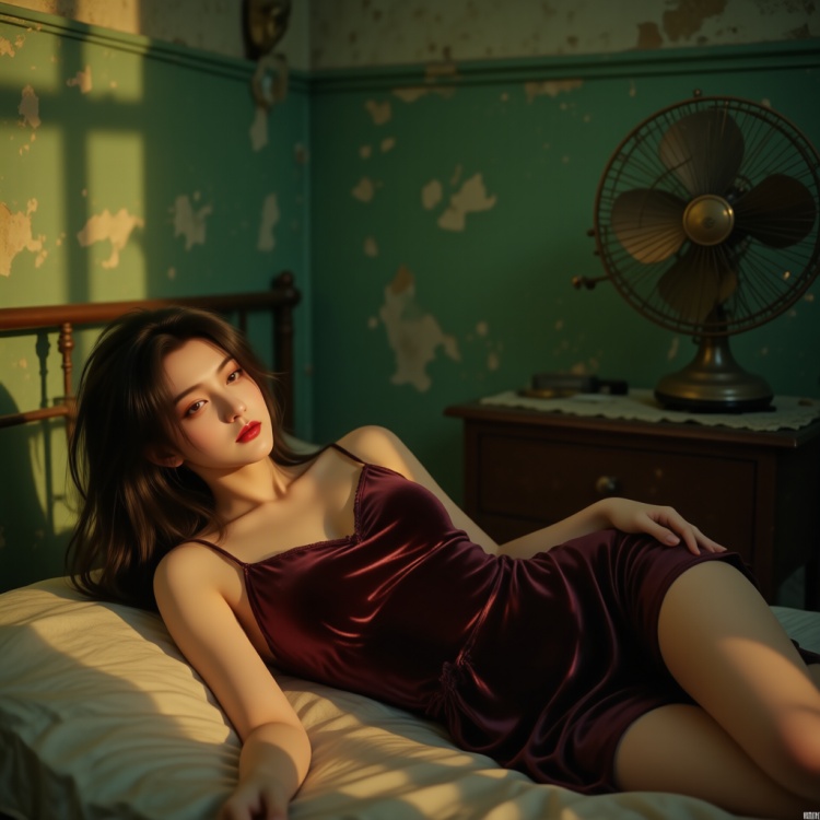 masterpiece, best quality, 1girl, a mesmerizing Asian woman with porcelain skin and bold red lips, wearing a deep burgundy velvet slip dress, lying on a bed in an old apartment, green peeling walls, a rotating vintage fan, cinematic lighting with strong contrast between warm skin tones and cool shadows, soft focus, Wong Kar-wai style, sensual, intimate, 4k, film grain