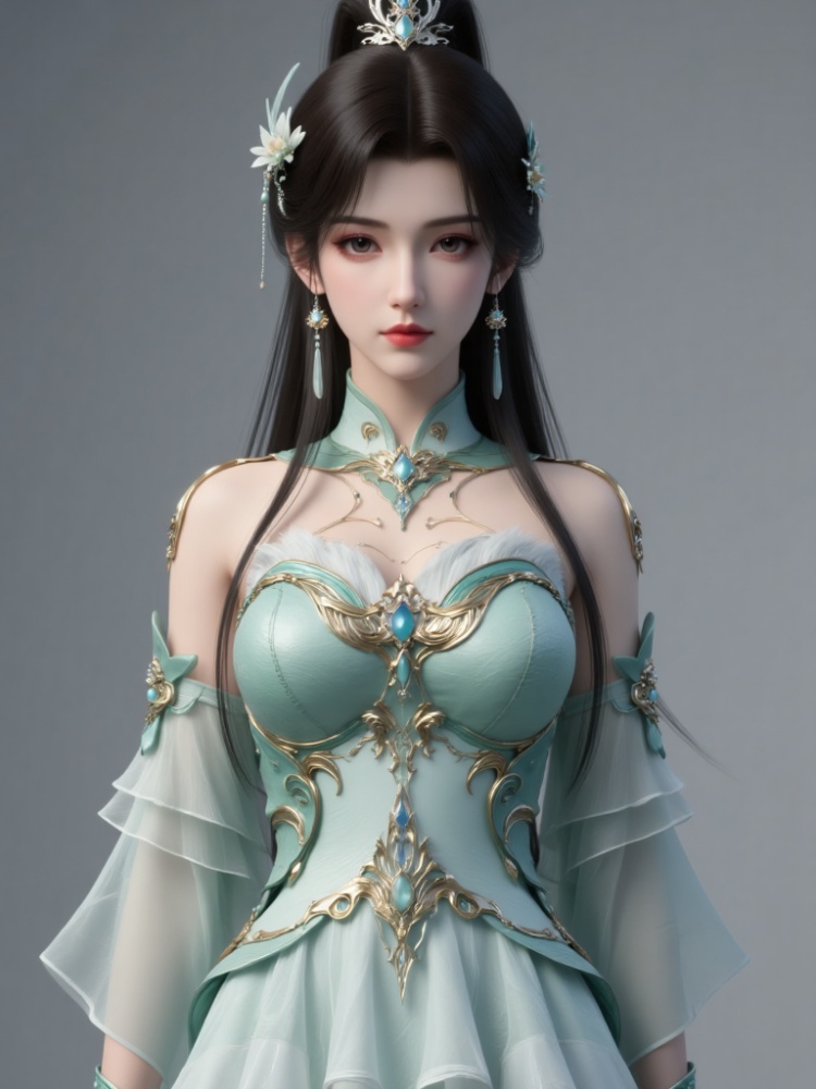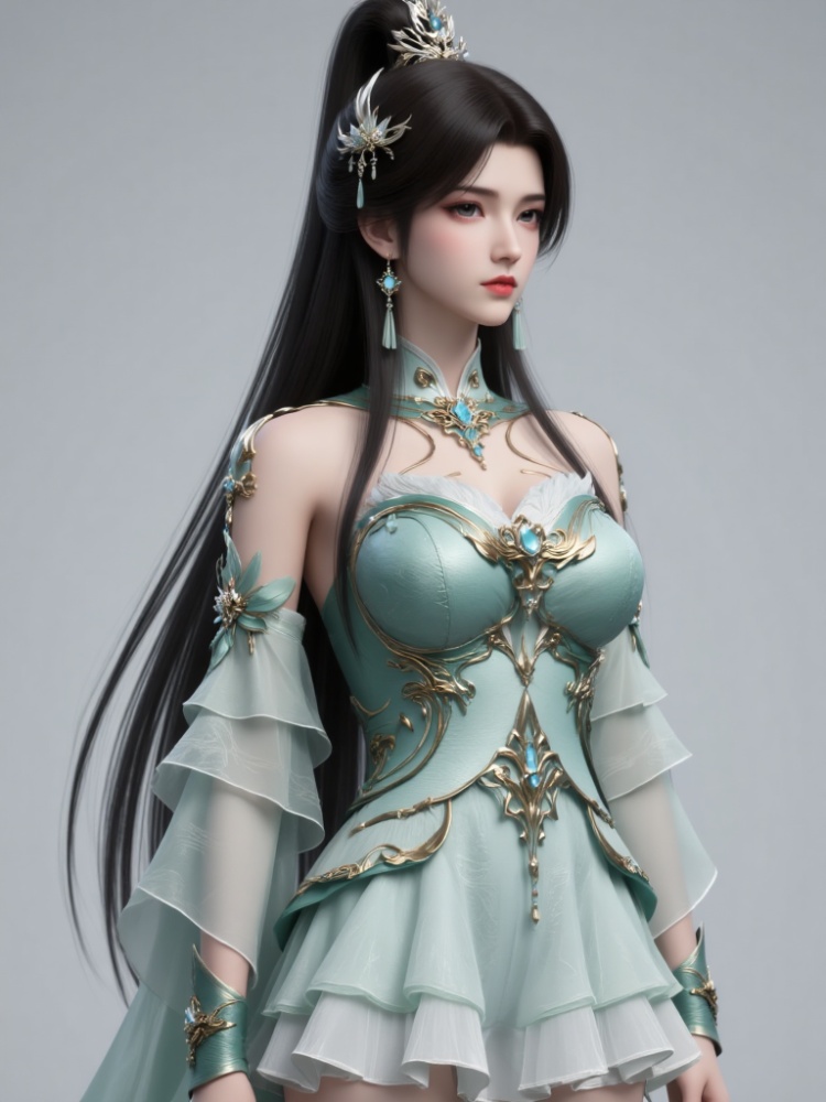 A girl with long black hair styled in a high ponytail, accessorized with hair ornaments and earrings. The outfit is a modified short-style qipao inspired by xianxia (immortal) ancient Chinese fashion. The top features a shoulder-exposing design with three-dimensional metal embellishments and multi-layered sheer sleeve hems. The bottom is a short layered skirt with flowing long side panels. Overall, it integrates xianxia elements with contemporary fashion design. The main color is teal green, paired with gold metal accents.fair-skinned