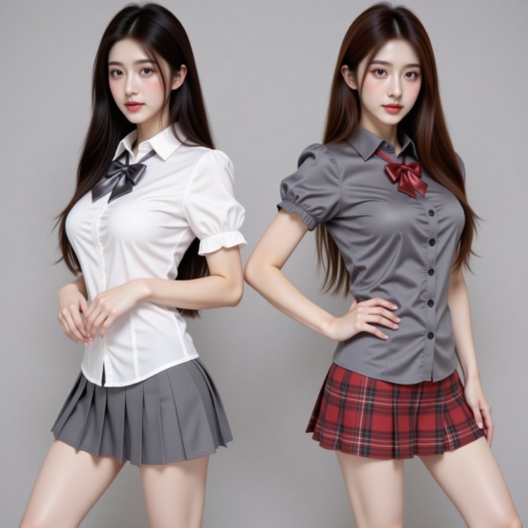 The second woman has long straight brown hair and fair, radiant skin. She wears a form-fitting gray short-sleeve blouse with a red necktie and a red plaid mini skirt. Her top highlights her medium-sized bust, and she stands with a slight forward lean, her right hand on her waist. Her expression is neutral, with soft makeup accentuating her eyes and lips.